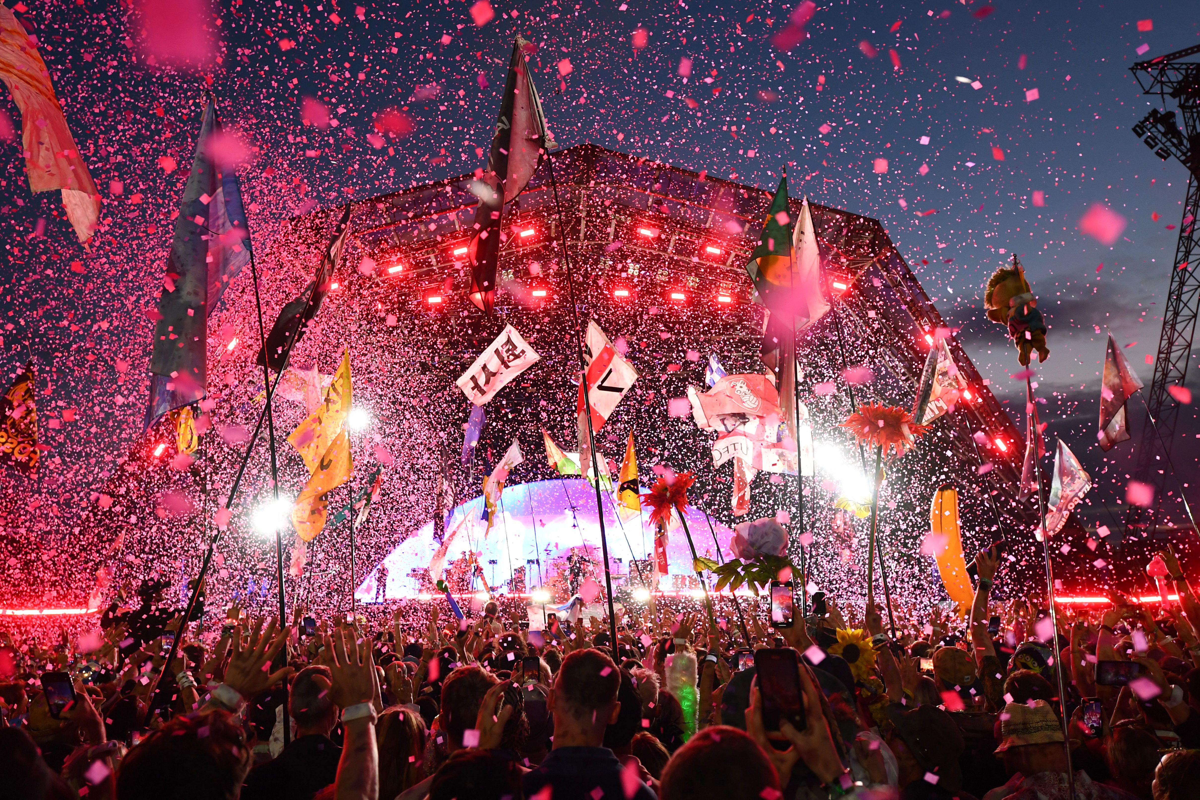 A general view of the crowd listening to ColdPlay perform during day four of Glastonbury Festival 2024 at Worthy Farm, Pilton on June 29, 2024 in Glastonbury, England. Founded by Michael Eavis in 1970, Glastonbury Festival features around 3,000 performances across over 80 stages. Renowned for its vibrant atmosphere and iconic Pyramid Stage, the festival offers a diverse lineup of music and arts, embodying a spirit of community, creativity, and environmental consciousness. (Photo by Joe Maher/Getty Images)