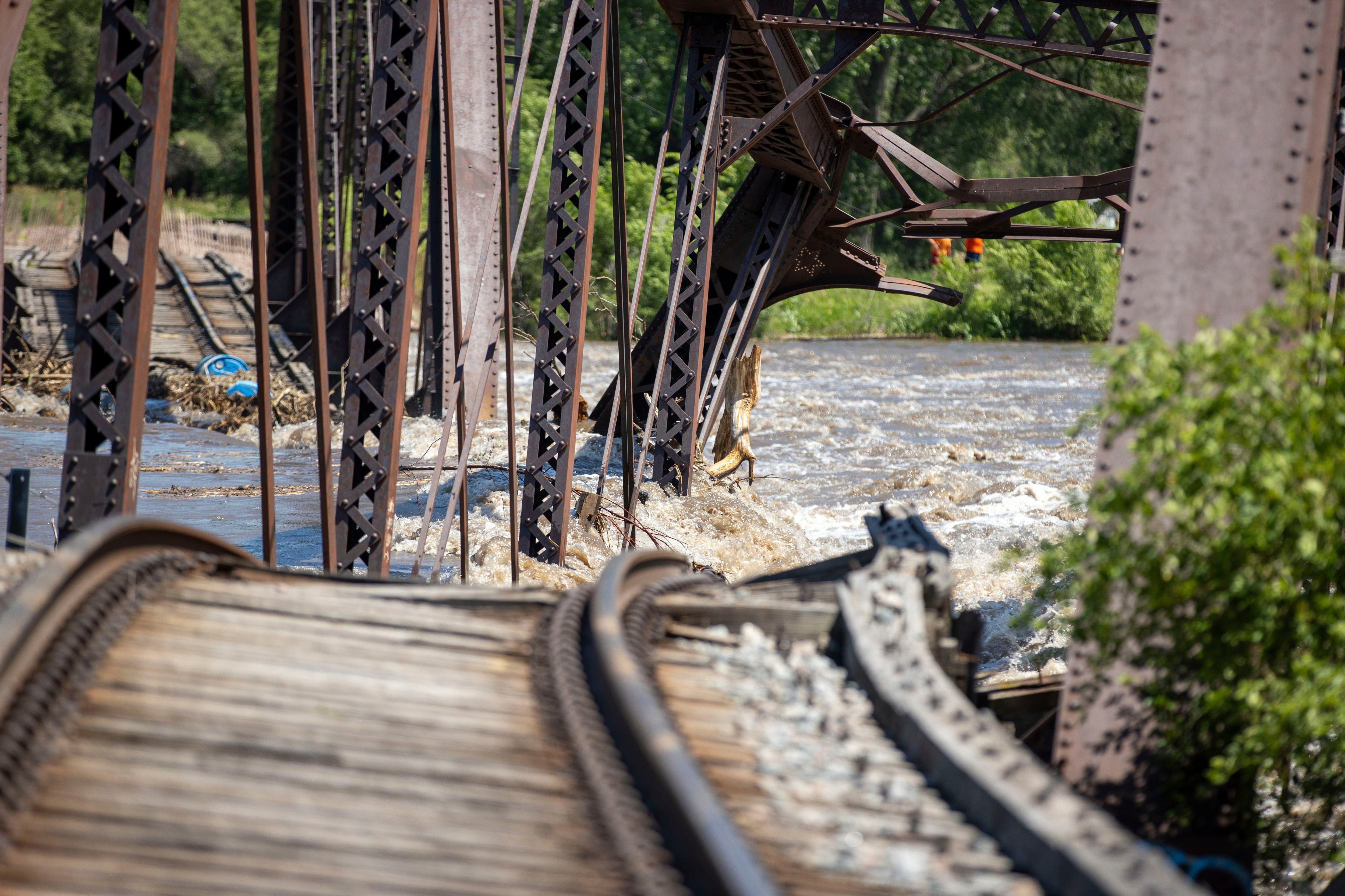 Debris from flooding gets caught in a railroad bridge over the Big Sioux River on Monday, June 24, 2024, near North Sioux City, S.D. Flooding in the Midwestern U.S. collapsed the bridge and sent water surging around a dam after days of heavy rains that have forced hundreds of people to evacuate or be rescued from rising waters. (Photo by Josh Jurgens/AP Photo)