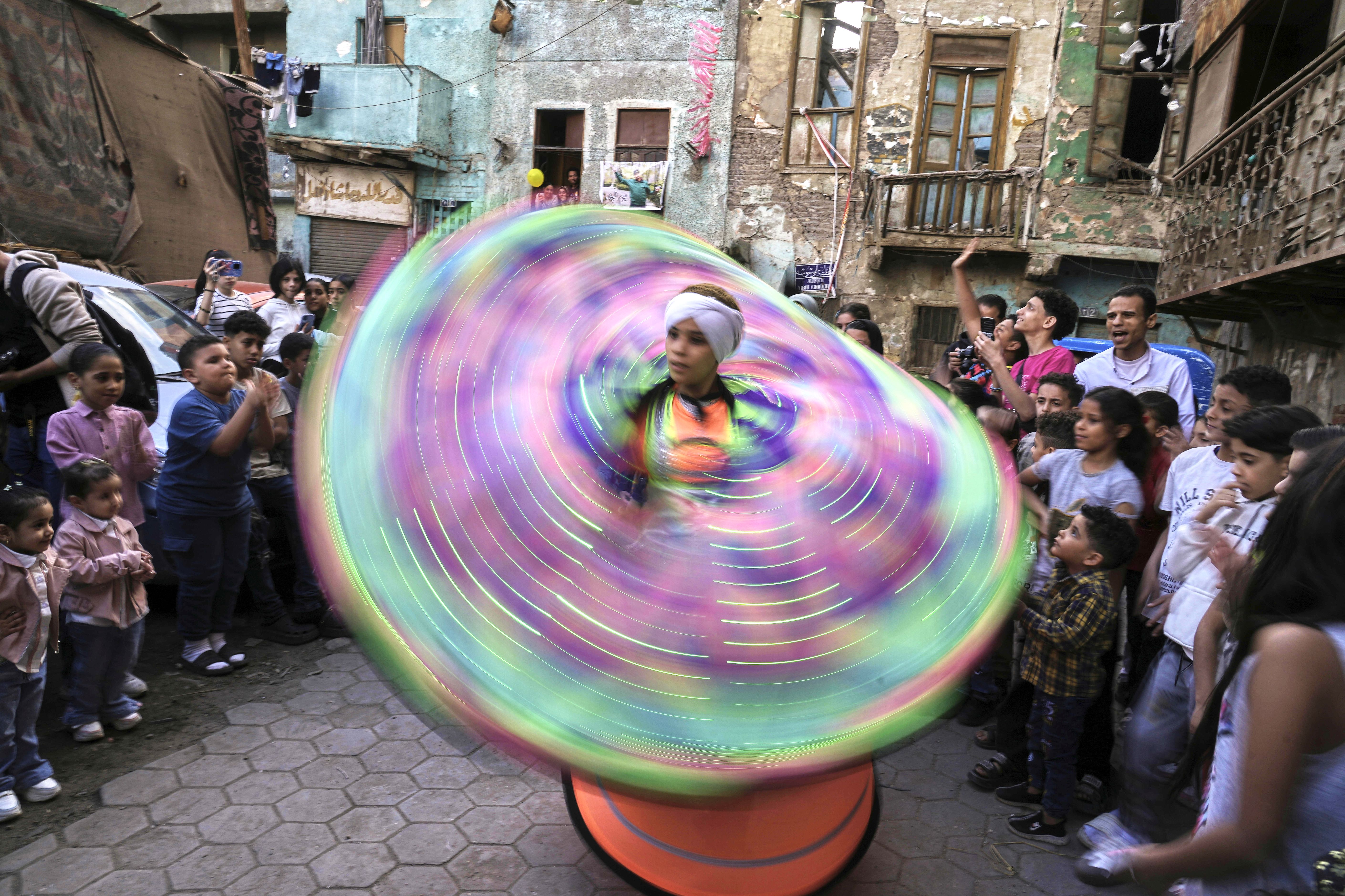 Rehab, a female whirling dervish, spins during a charity day organized by a group of volunteers who distribute toys and food at Darb Shughlan popular district in Cairo, Friday, April 11, 2025. (Photo by Amr Nabil/AP Photo)