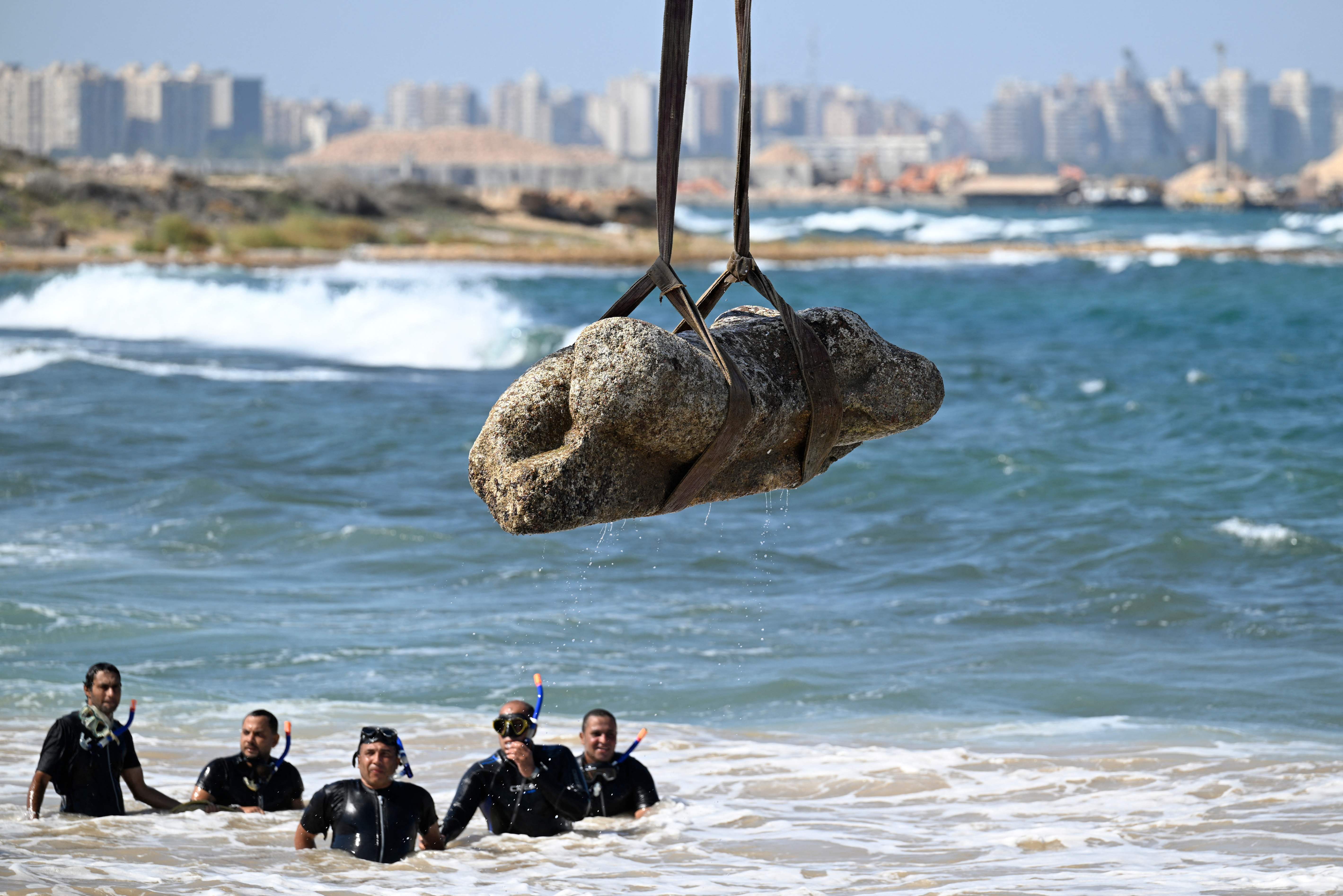 Divers watch as a crane pulls a piece of stone from the waters at Abu Qir bay in Alexandria on August 21, 2025, as part of an event organized by the Ministry of Tourism and Antiquities to recover sunken antiquities. (Photo by Khaled Desouki/AFP Photo)