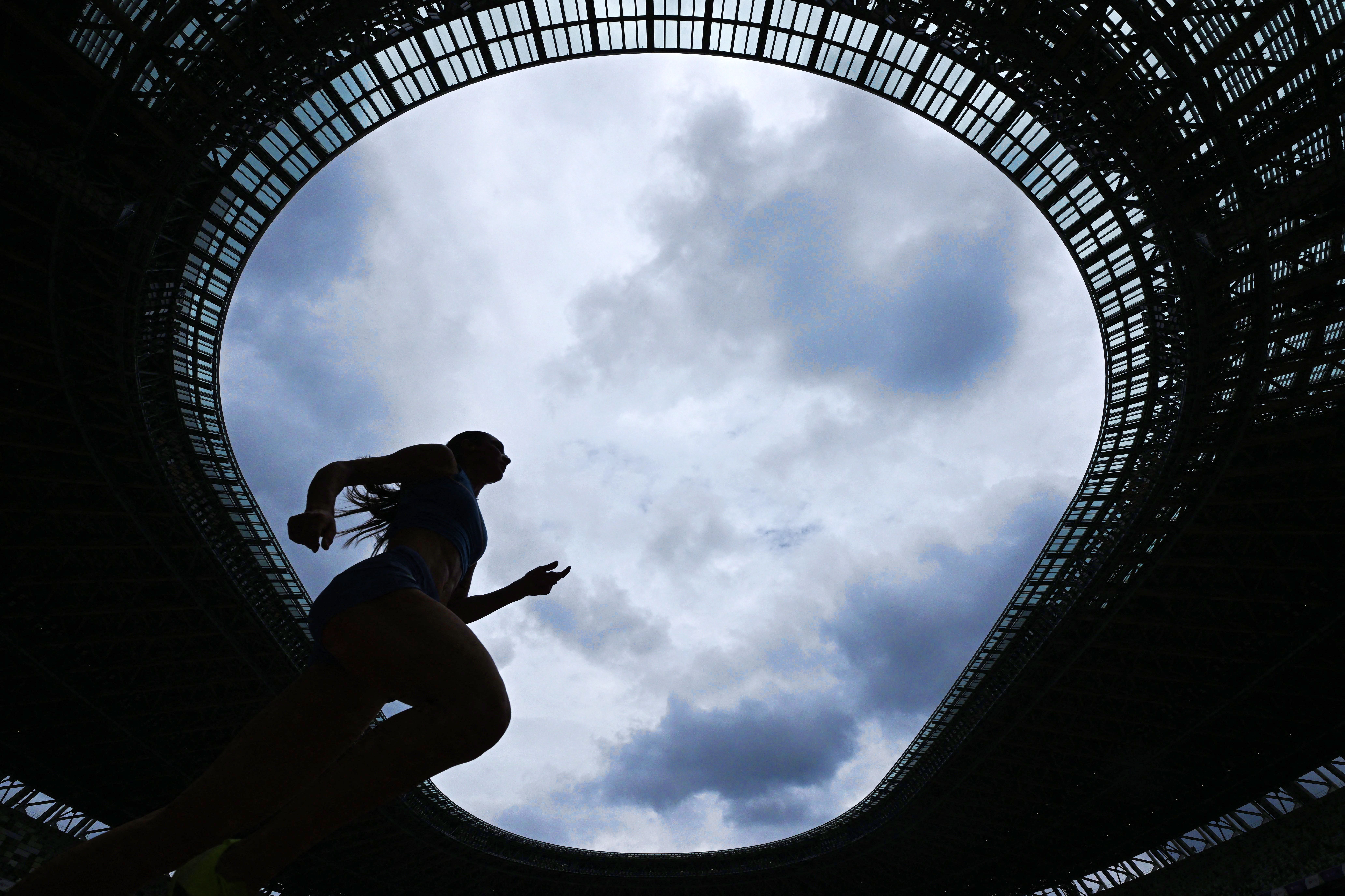An athlete takes part in a warm-up around the track of the National Stadium in Tokyo on September 12, 2025, ahead of the World Athletics Championships. (Photo by Kirill Kudryavtsev/AFP Photo)