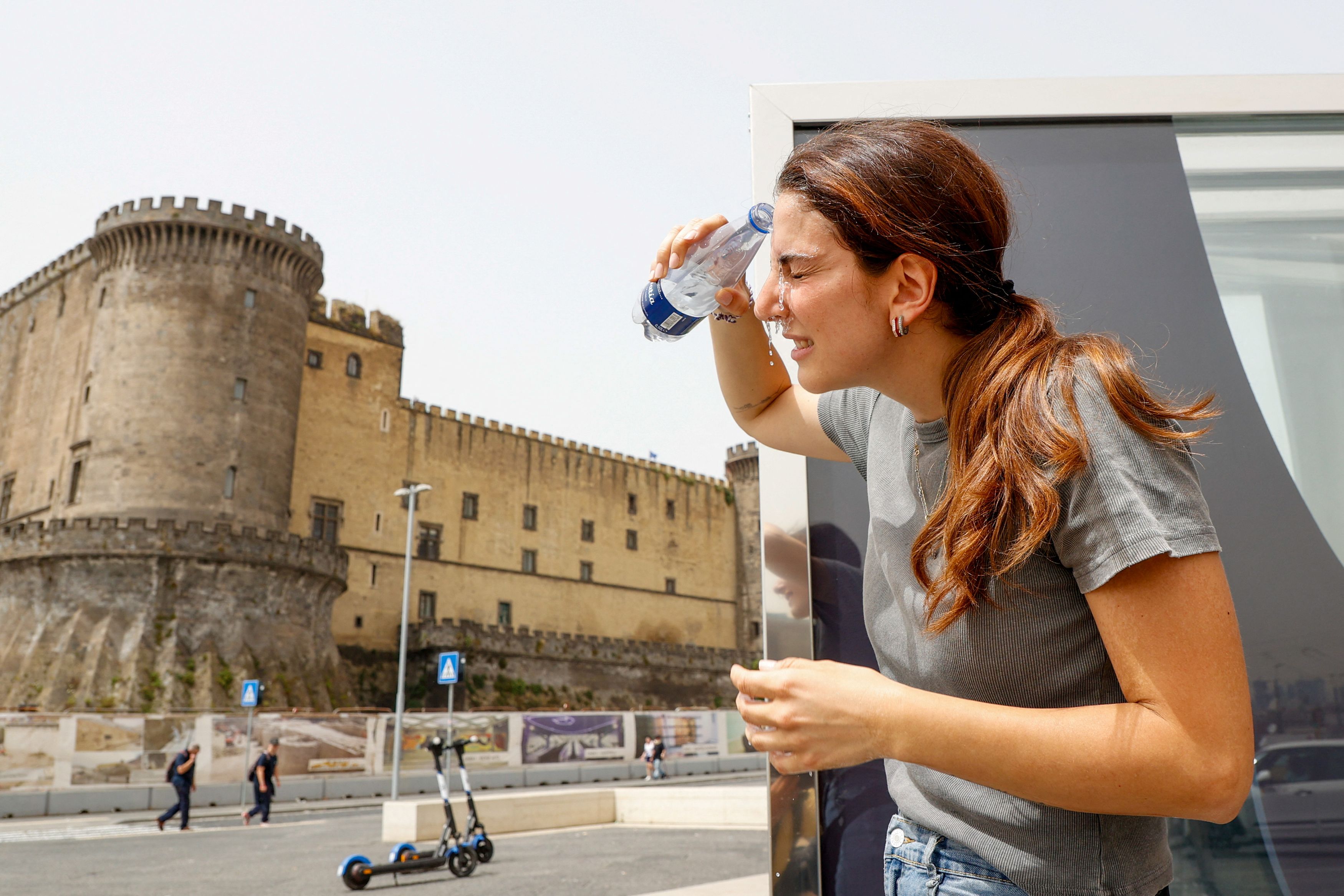 Woman cools off with water during a heatwave in Naples, Italy, on June 21, 2024. (Photo by Ciro De Luca/Reuters)