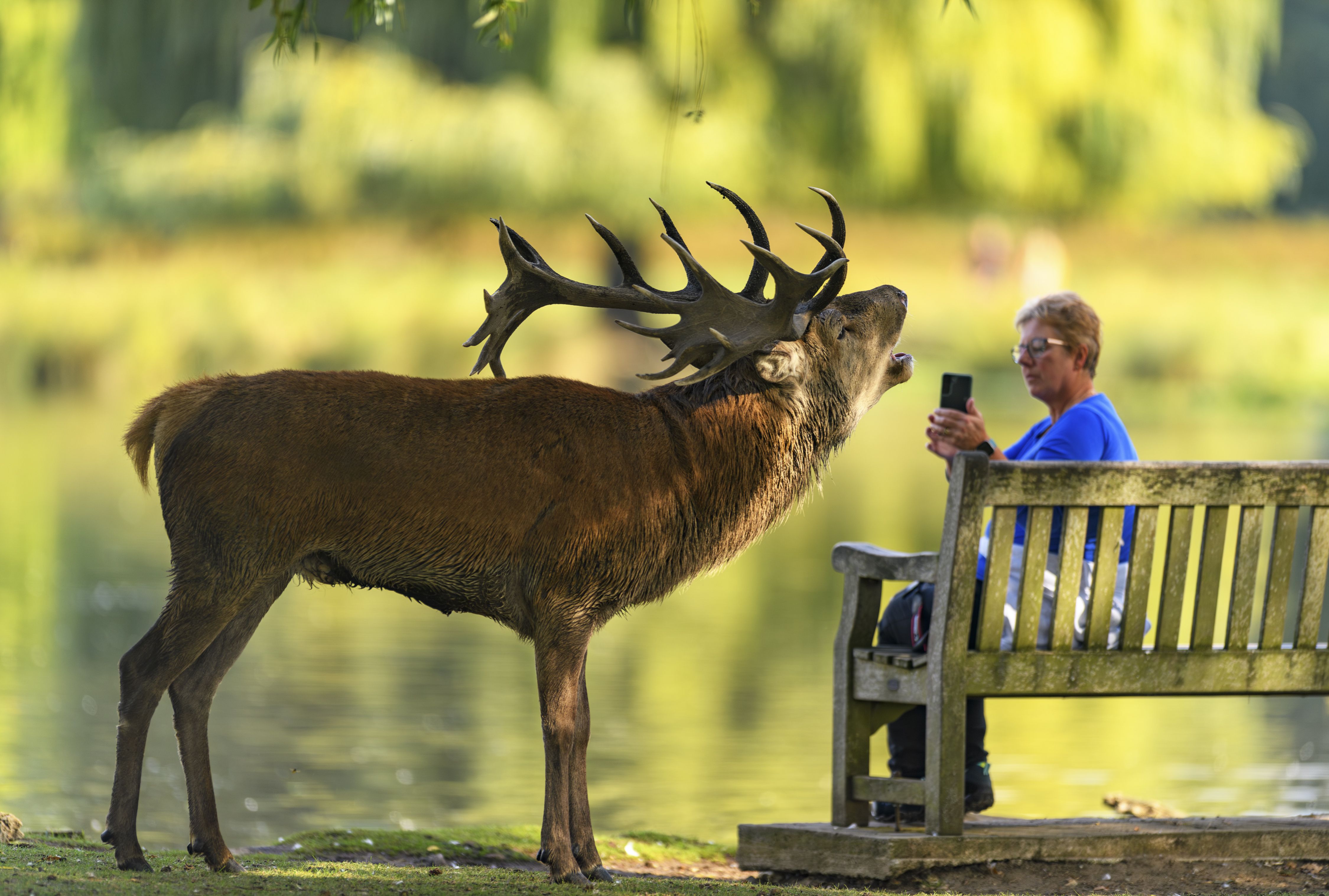 A stag appears to stop to pose for a woman taking picture in Richmond Park, southwest London in the last decade of September 2025. (Photo by Robert Piper/Caters News Agency)