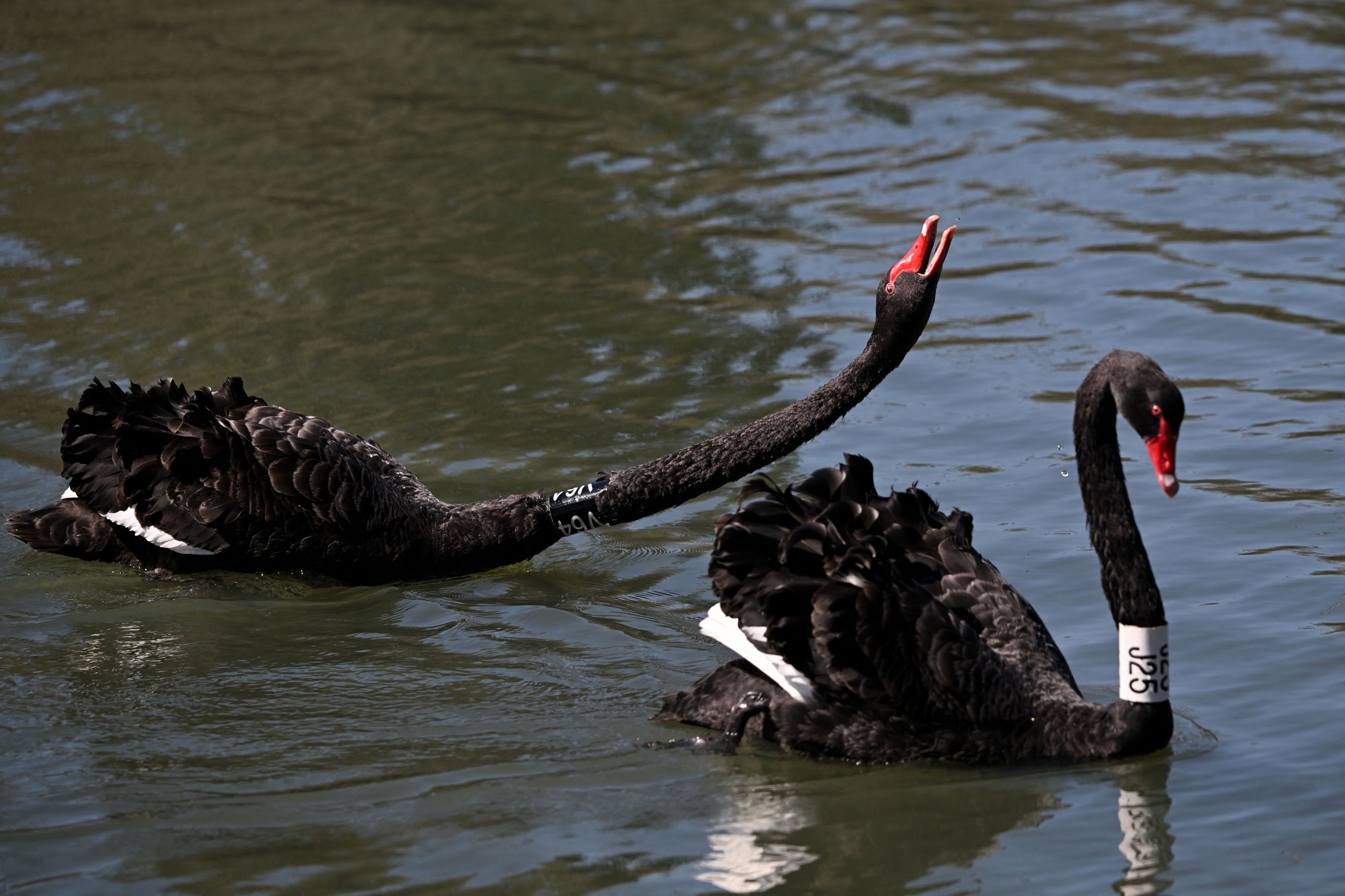 Swans interact on Melbourne's Albert Park Lake on September 29, 2025. The swans are part of a research study by The University of Melbourne to monitor the birds' movements, behaviour, and health using numbered neck collars. (Photo by William West/AFP Photo)