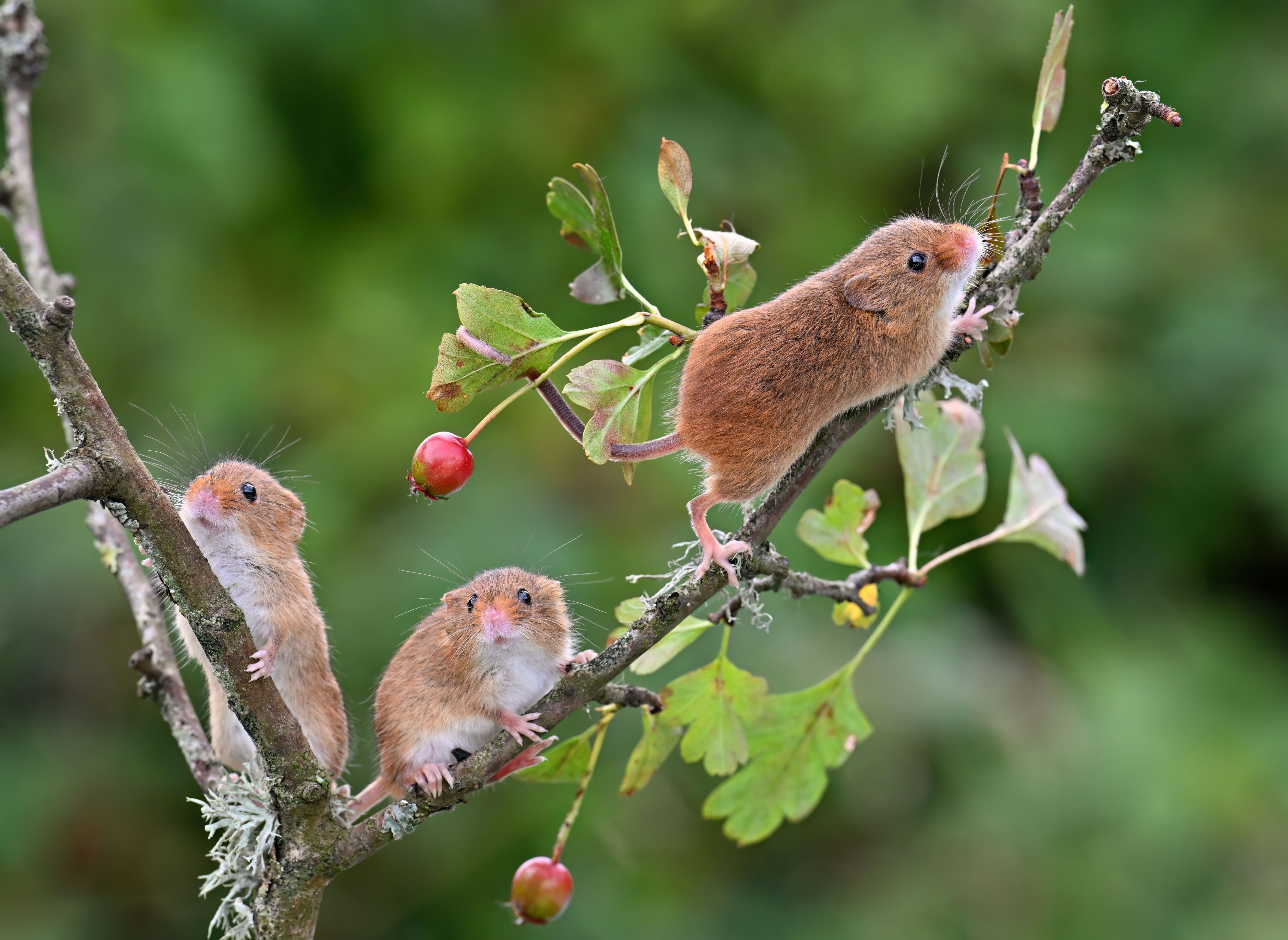 The small rodent covers its face with its feet while standing on a rose tree. The images show a pair of 12-month-old mice enjoying exploring and improving their climbing skills. The pictures were taken by photographer Alan Benson during a wildlife hides workshop in Wimborne, Dorset, UK in the last decade of September 2025. (Photo by Alan Benson/Solent News & Photo Agency)