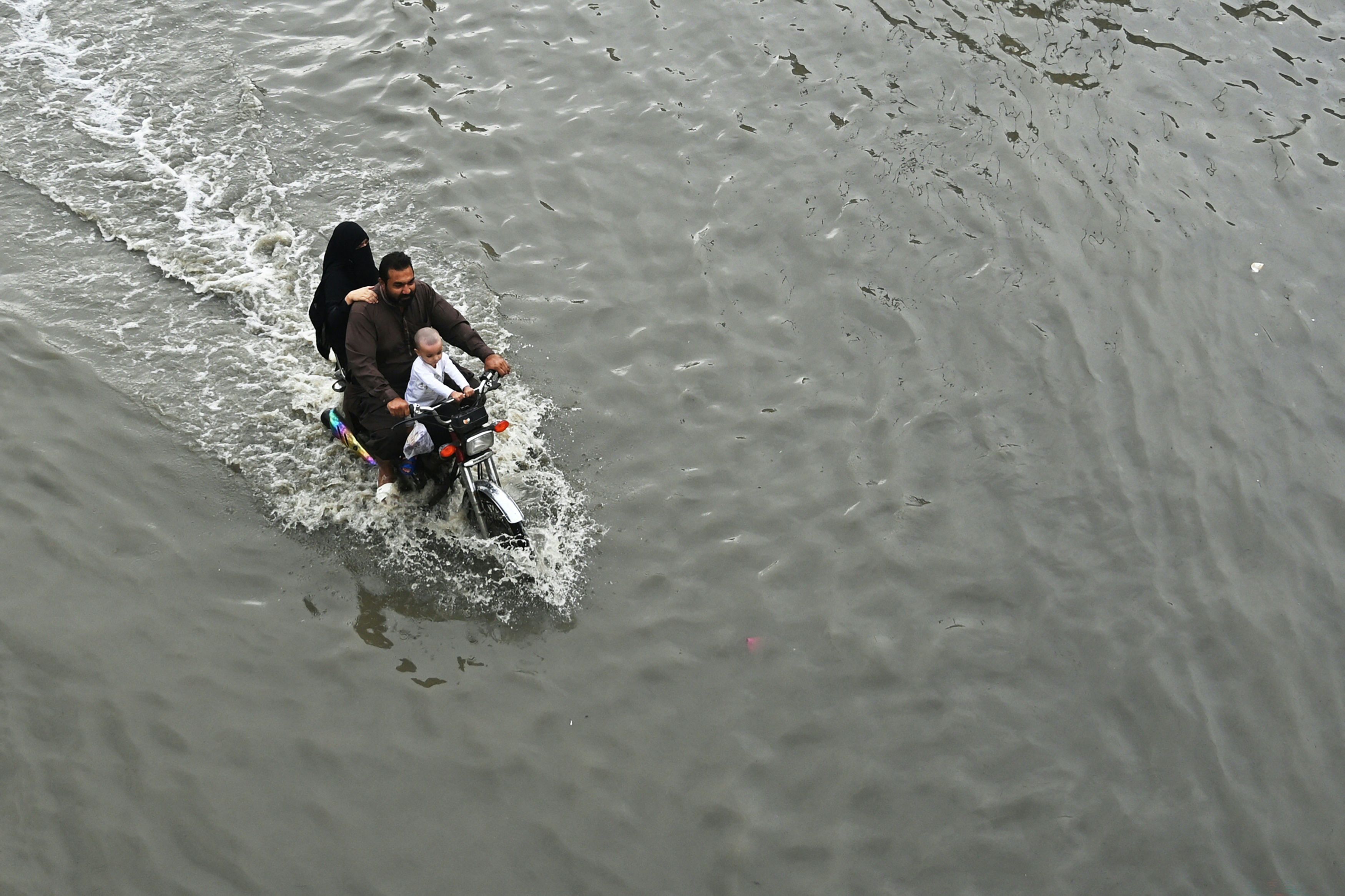 Commuters wade through a flooded street after heavy rainfall in Karachi on September 10, 2025. (Photo by Asif Hassan/AFP Photo)