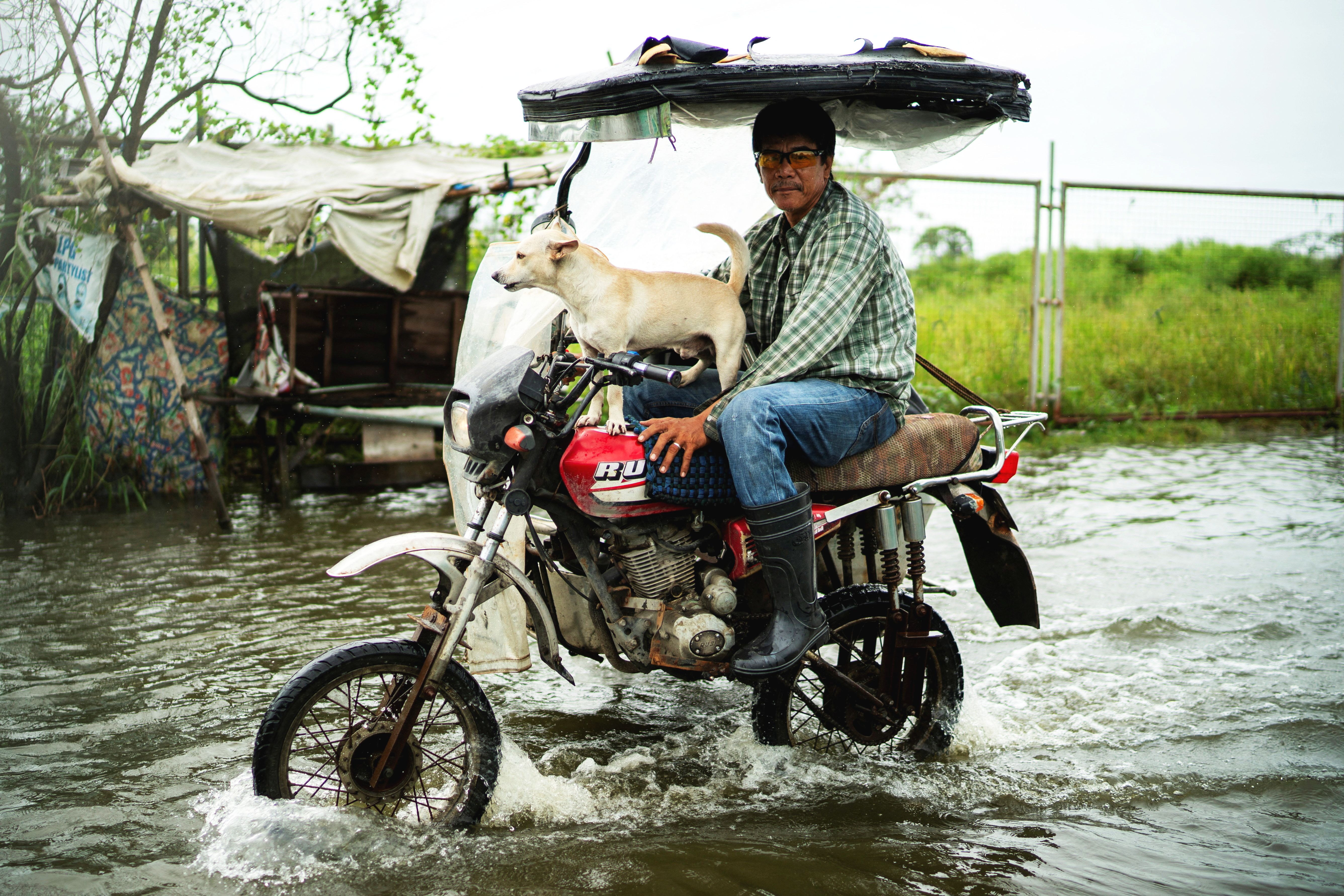 A motorist with a dog wades through a flooded road, following heavy rains intensified by Super Typhoon Ragasa, in Apalit, Pampanga province, Philippines, on September 23, 2025. (Photo by Lisa Marie David/Reuters)