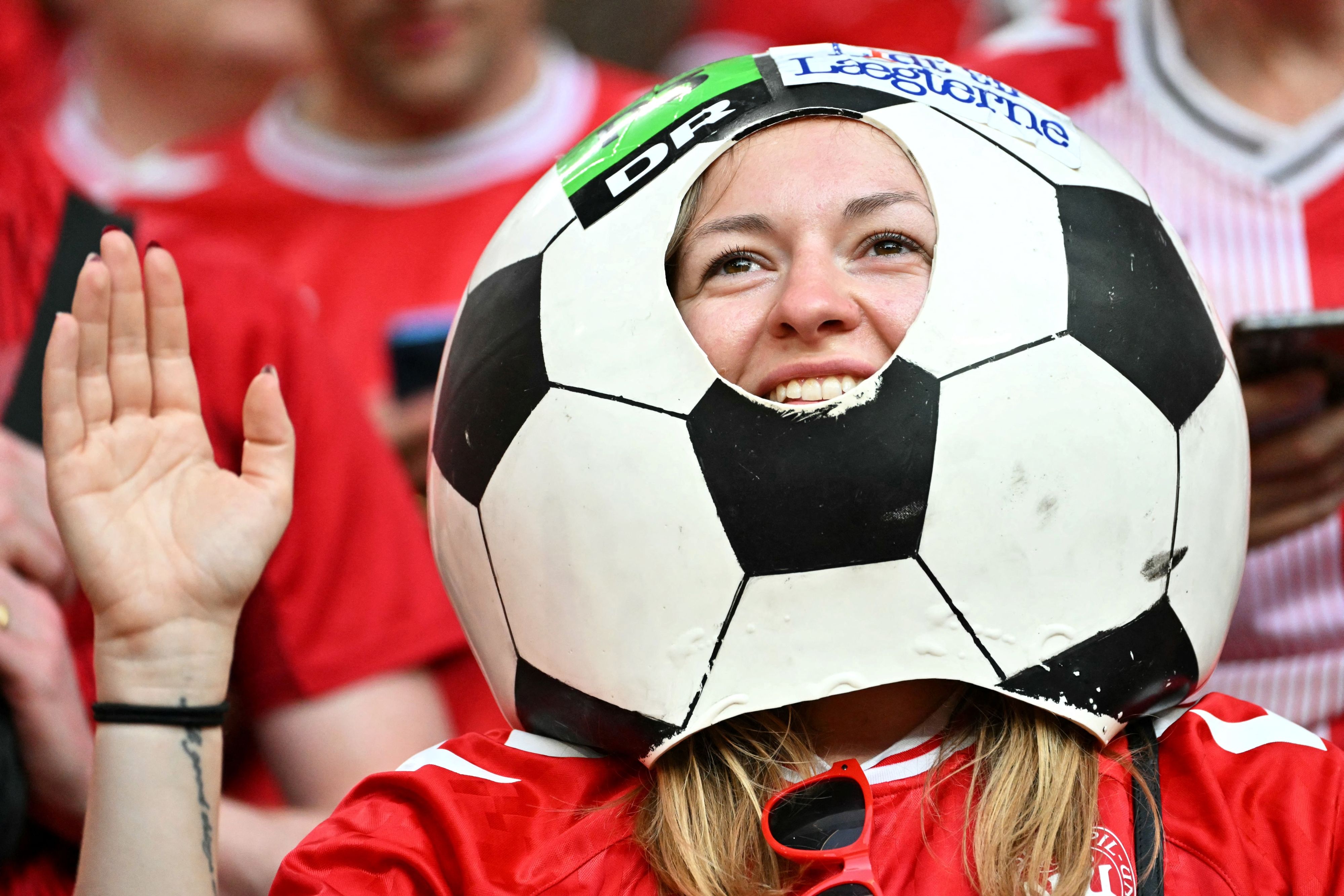 A Denmark supporter cheers prior to the UEFA Euro 2024 Group C football match between Denmark and Serbia at the Munich Football Arena in Munich on June 25, 2024. (Photo by Miguel Medina/AFP Photo)