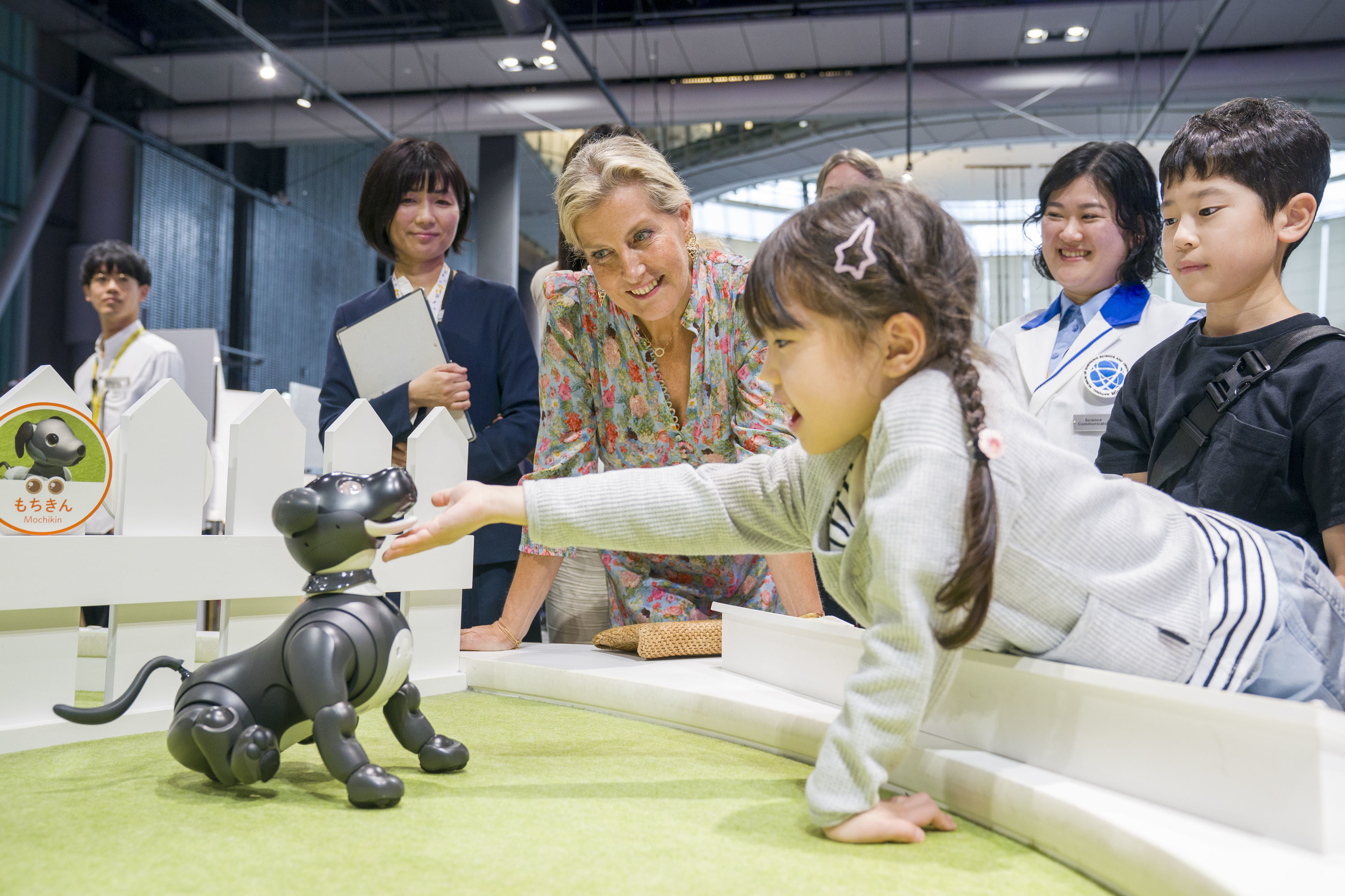 The Duchess of Edinburgh looks at a robot dog with Yumi Takeyama, aged 6, during a visit to Miraikan, The National Museum of Emerging Science in Tokyo, which pioneers cutting-edge science and technology related to themes such as space, the global environment, and robotics, on day two of the royal trip to Japan on Saturday, September 20, 2025. (Photo by Jane Barlow/PA Wire)