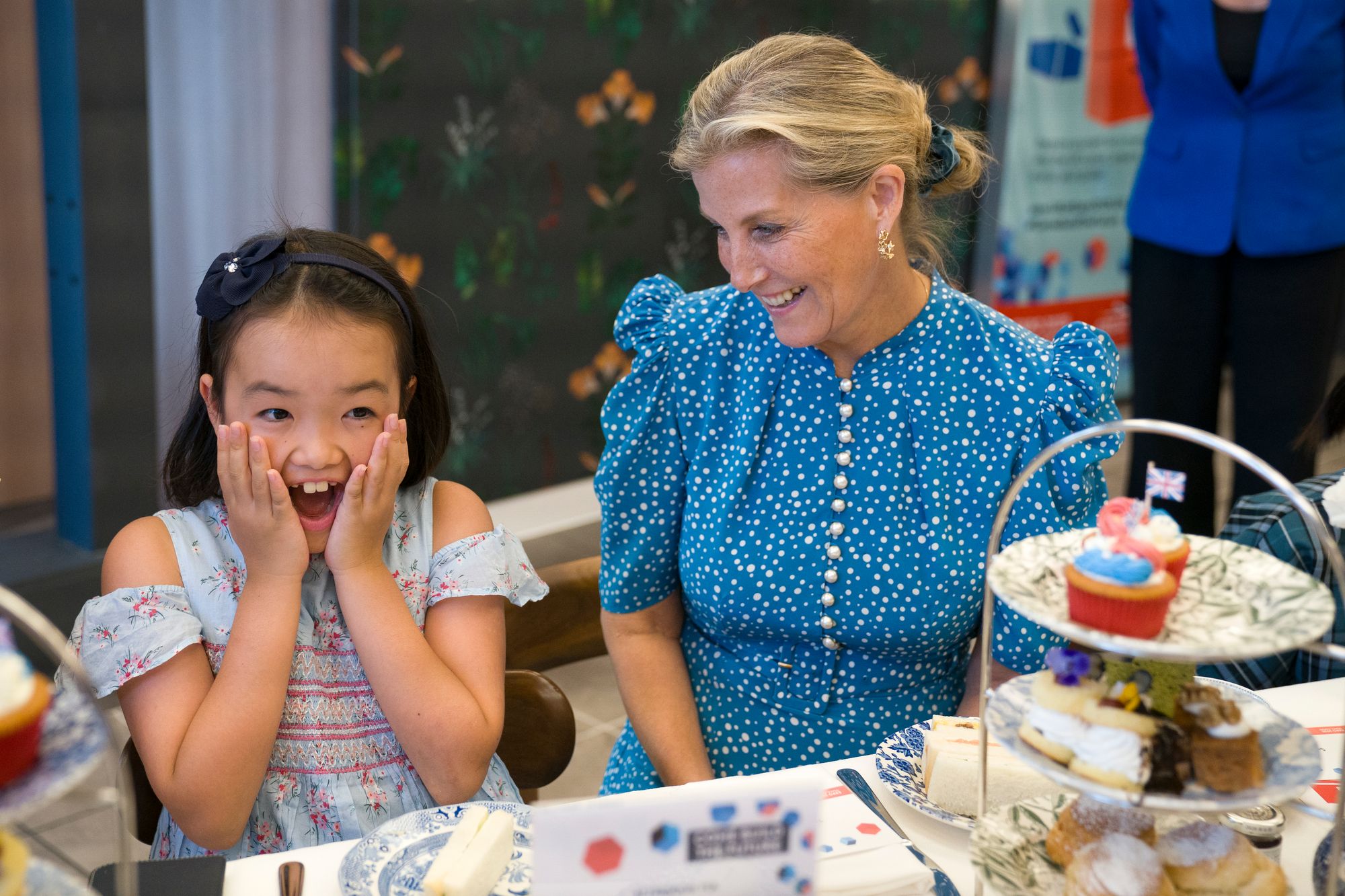 The Duchess of Edinburgh meets Asahi Okada, aged 9, at the children's tea party held in the UK Pavilion with children, and their parents, who created music for the UK Pavilion, during a visit to Osaka Expo 2025 on day four of the royal trip to Japan on Monday, September 22, 2025. (Photo by Jane Barlow/PA Images via Getty Images)
