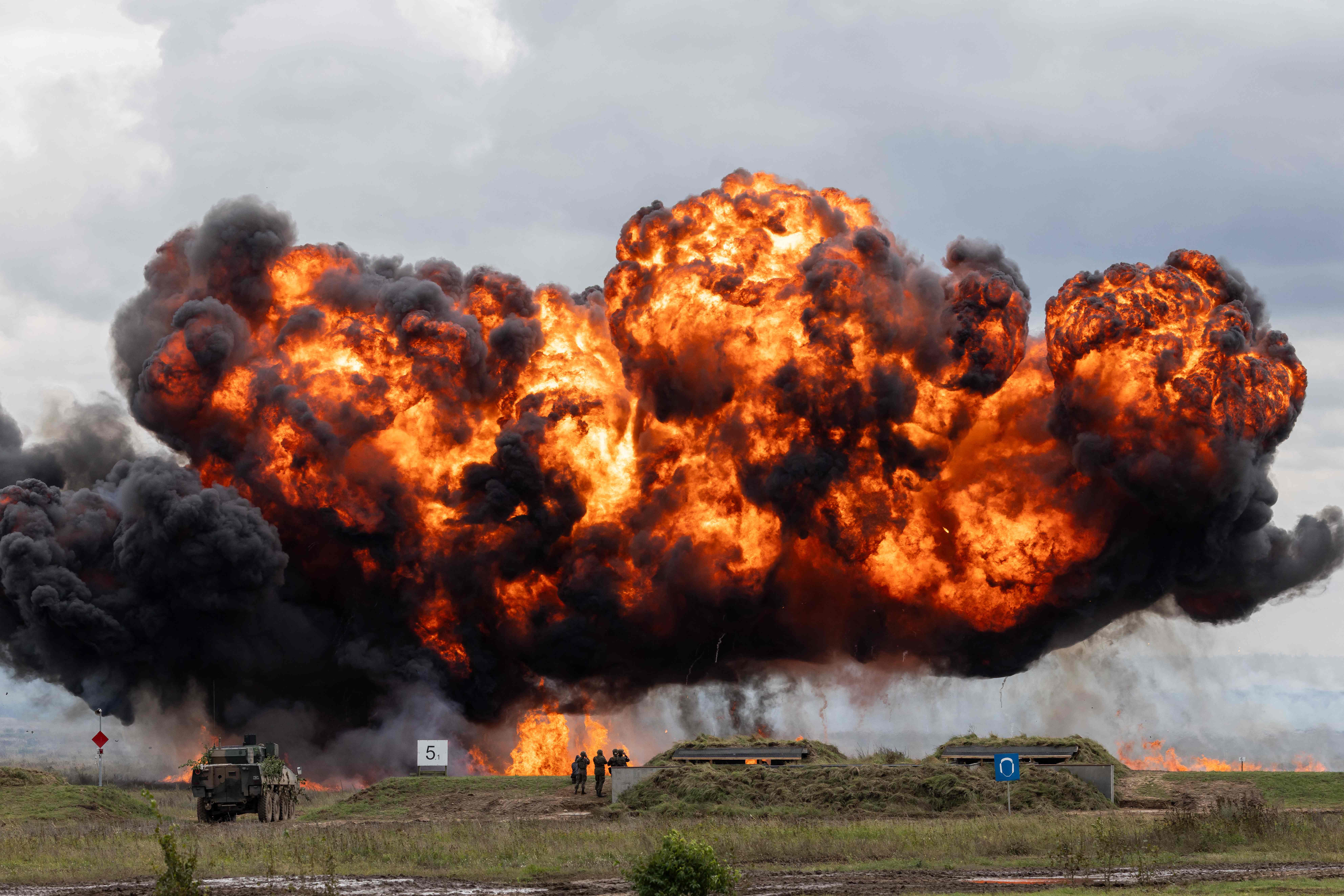 A cloud of smoke and fire rises over the field during military exercises of Poland and NATO allied countries in Orzysz on September 17, 2025. (Photo by Wojtek Radwanski/AFP Photo)
