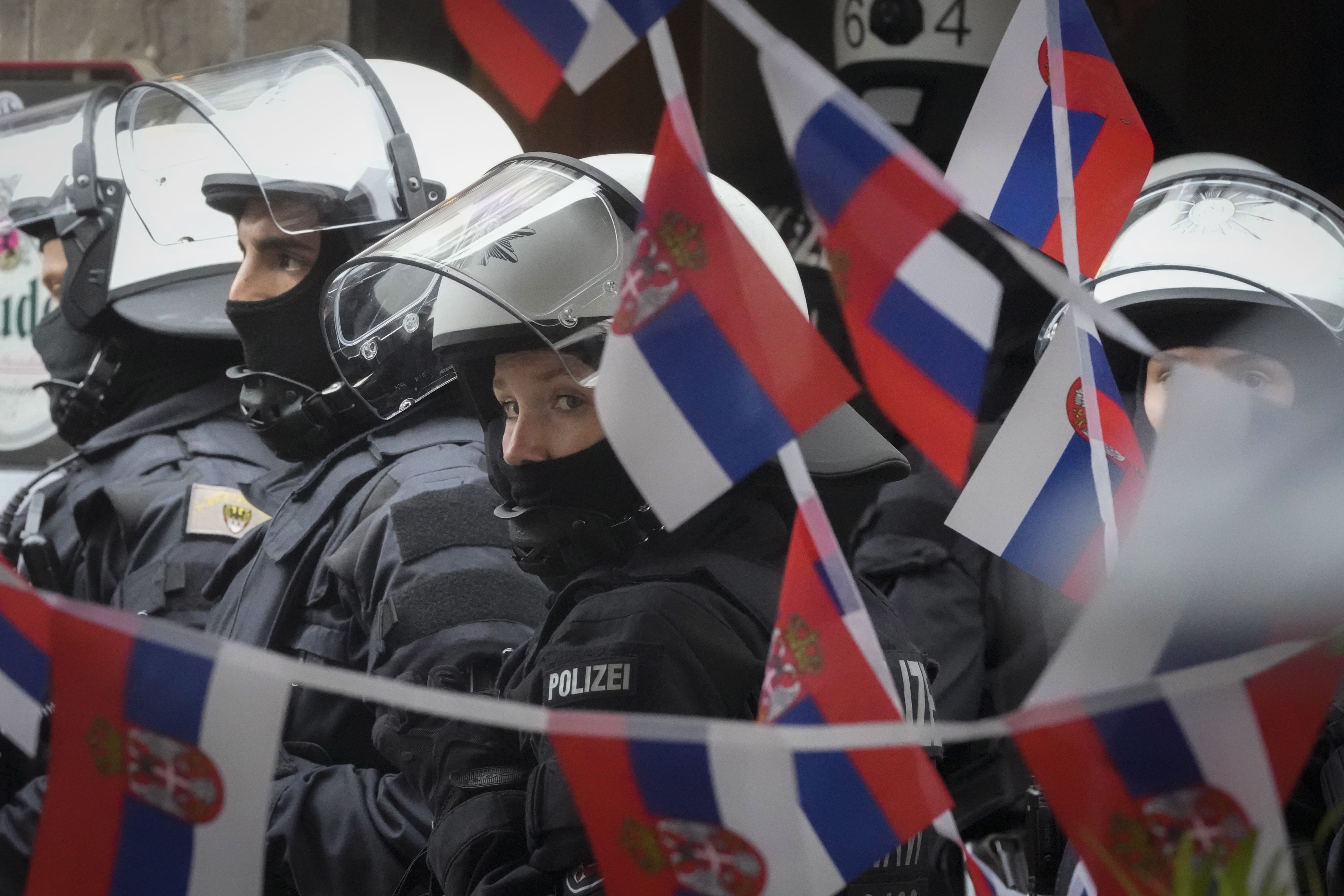 Police stand next to a restaurant decorated with Serbian flags ahead the Group C match between Serbia and England at the Euro 2024 soccer tournament in Gelsenkirchen, Germany, Sunday, June 16, 2024. (Photo by Markus Schreiber/AP Photo)