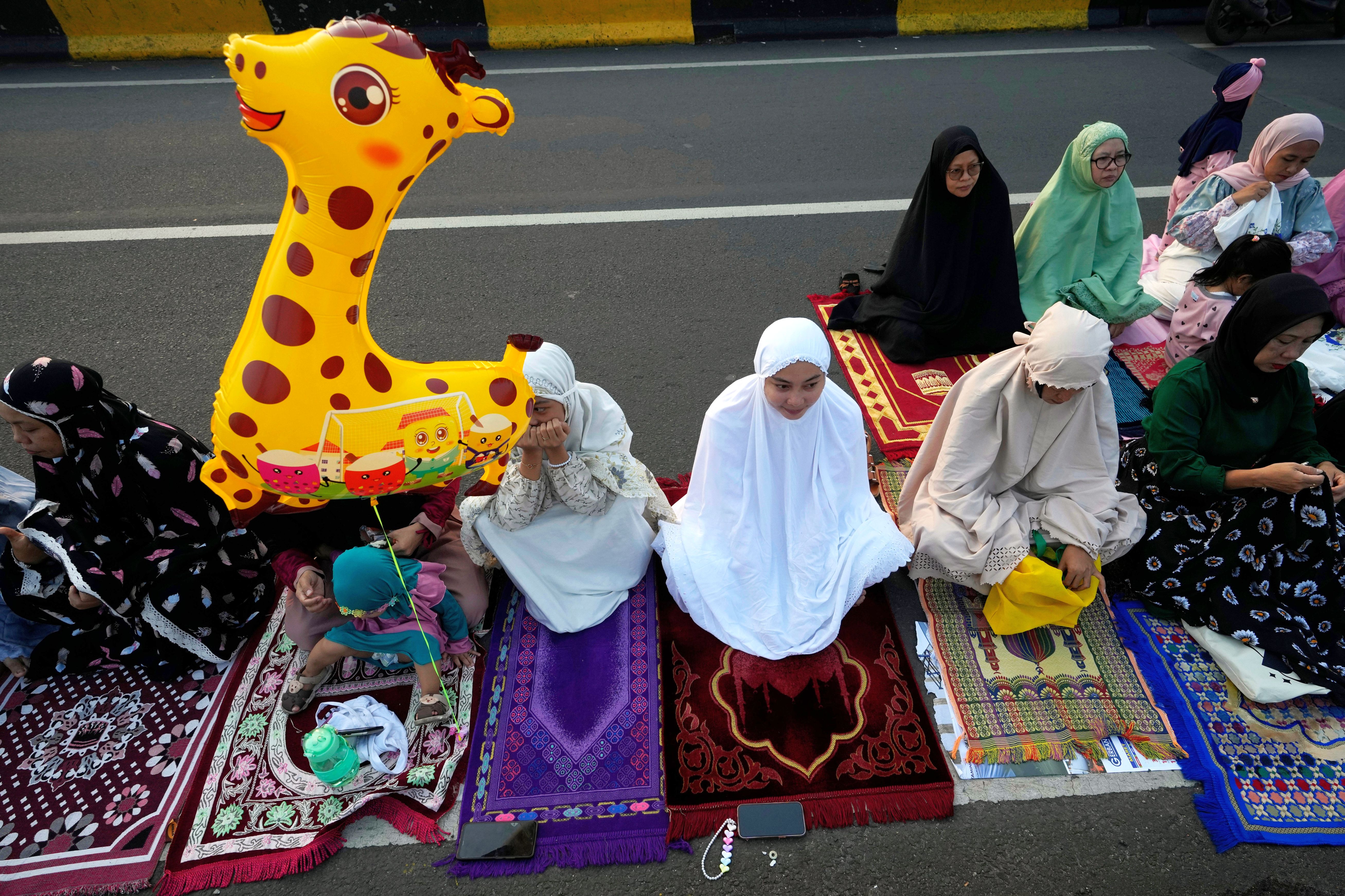 Muslims attend for Eid al-Adha prayer on a street in Jakarta, Indonesia, Monday, June 17, 2024. Muslims around the world celebrate Eid al-Adha by sacrificing animals to commemorate the prophet Ibrahim's faith in being willing to sacrifice his son. (Photo by Achmad Ibrahim/AP Photo)