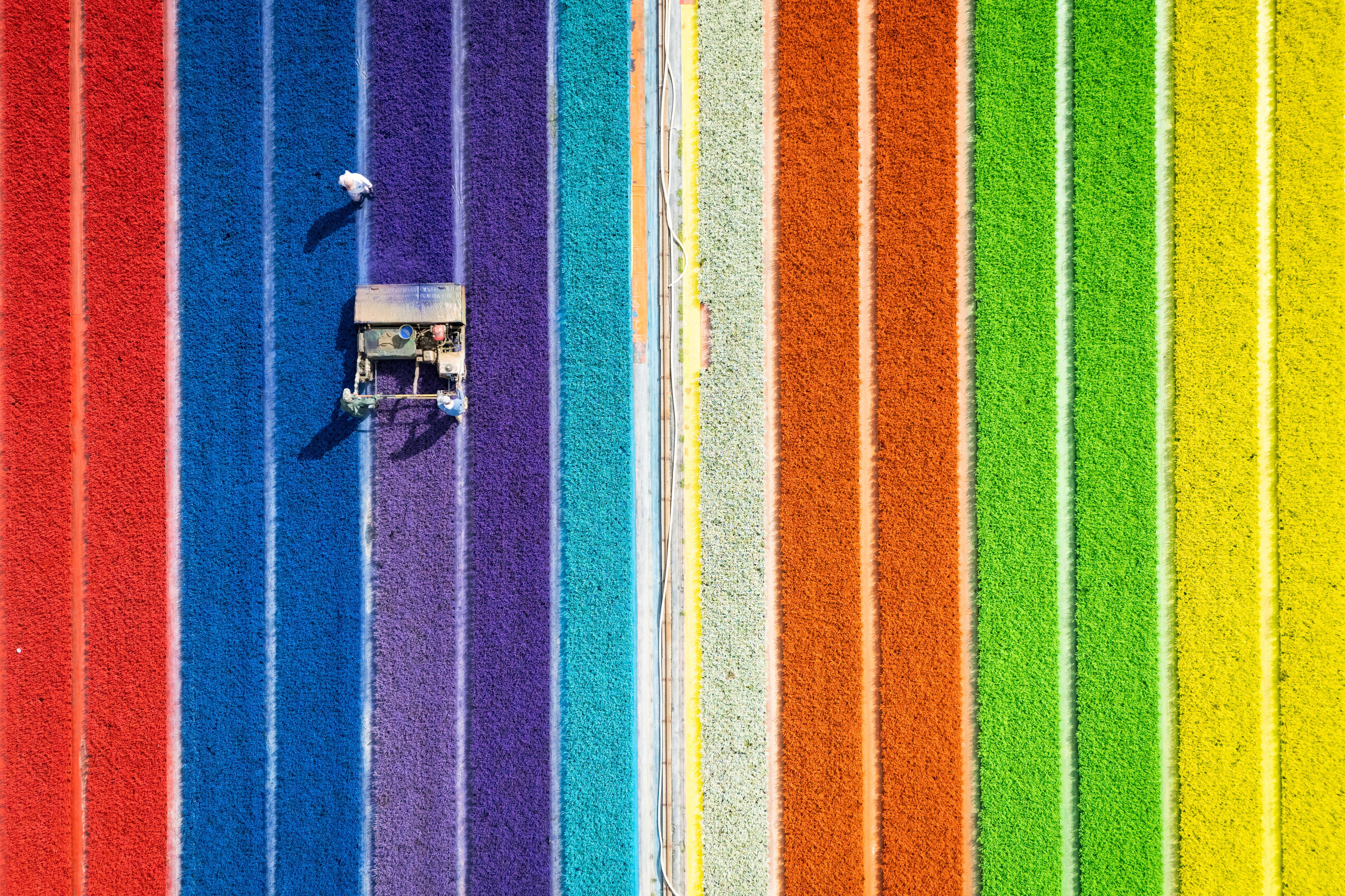 An aerial view taken on September 11, 2025 shows employees of 'Les Callunas d'Alsace' paint with water-based paint made some Callunas Vulgaris, in Obernai, eastern France. (Photo by Sebastien Bozon/AFP Photo)