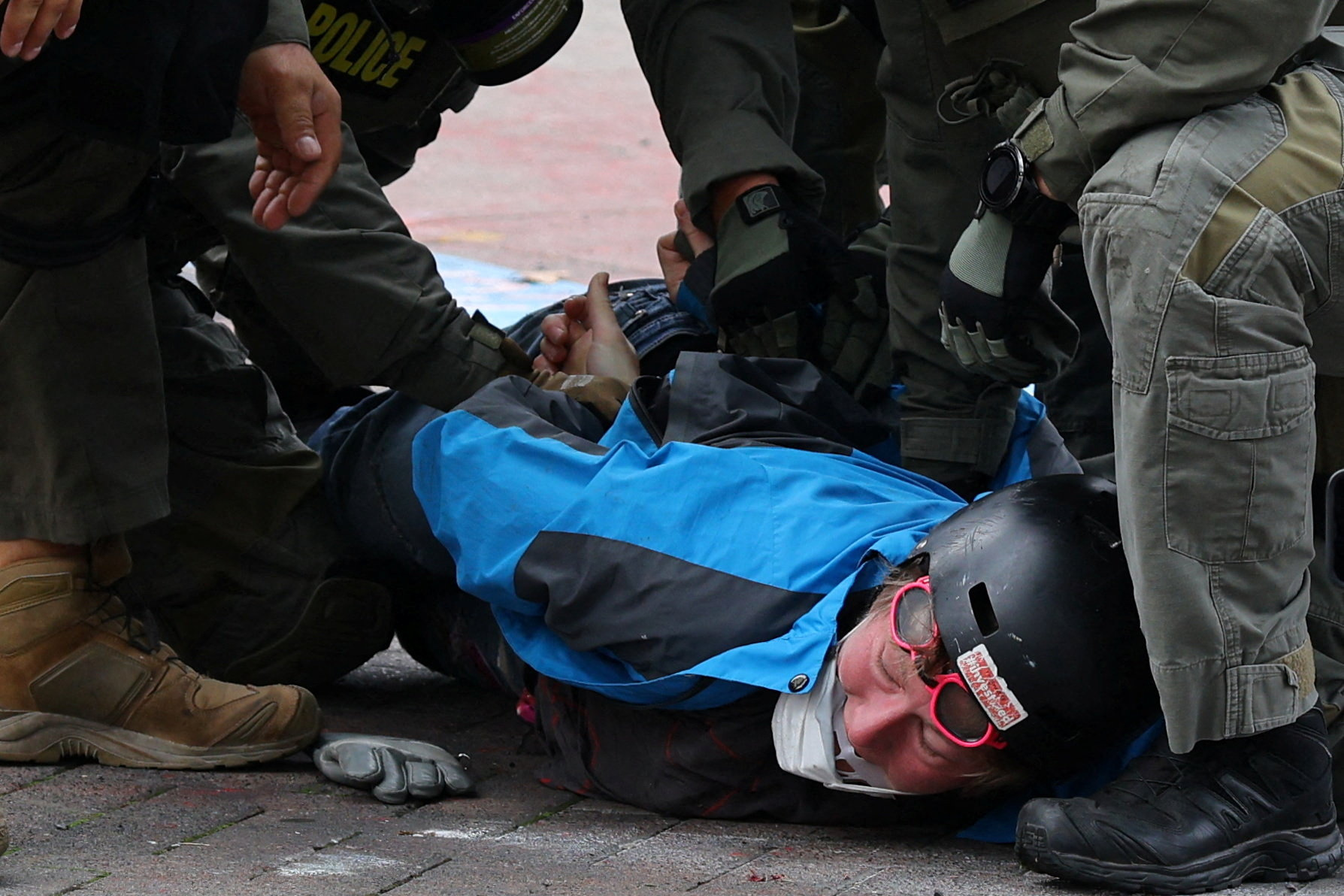 Law enforcement officers detain a protester outside the ICE headquarters in Portland, Oregon, U.S., October 4, 2025. (Photo by Carlos Barria/Reuters)