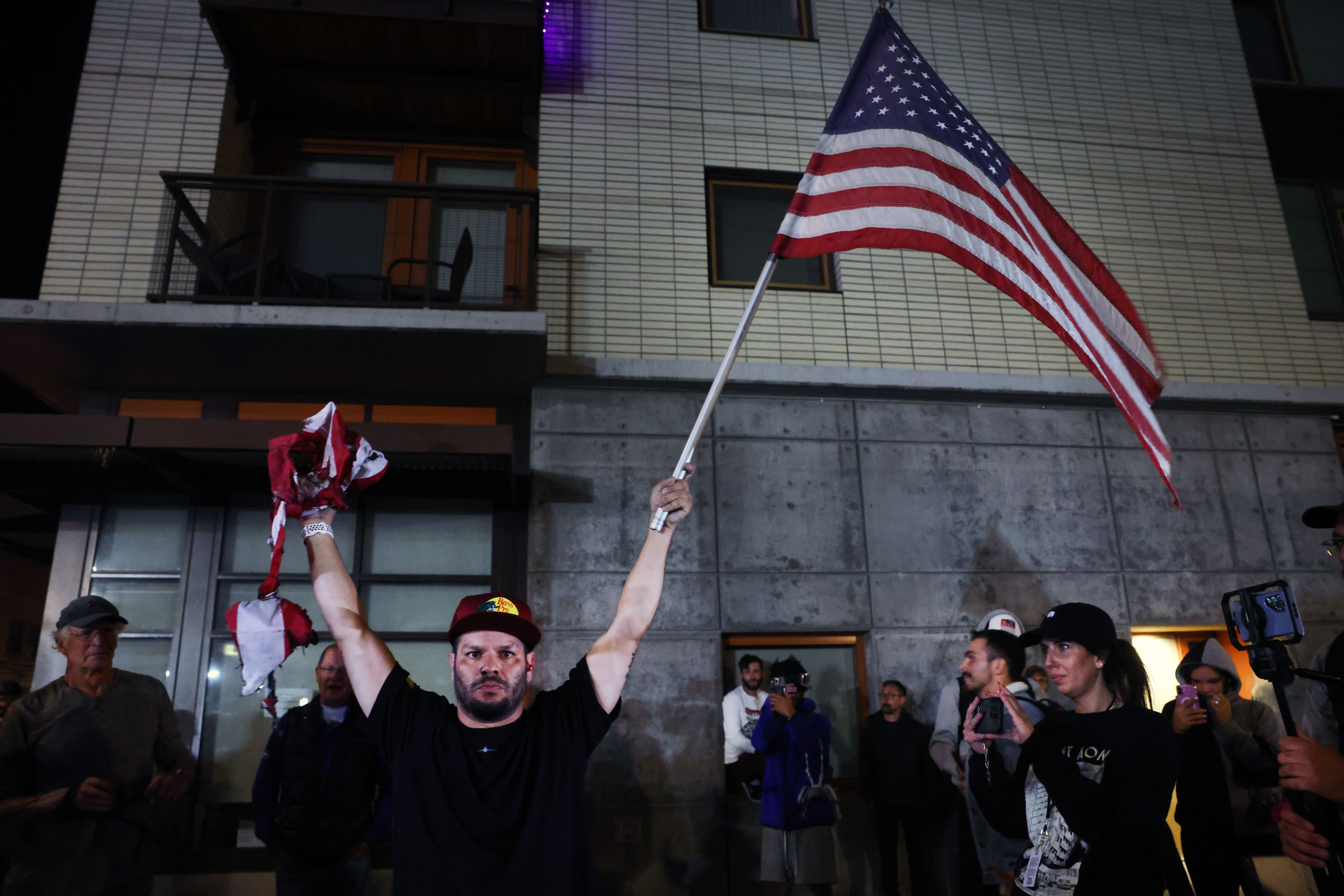 Supporters of Donald Trump clash with dozens of protesters against his administration outside a downtown U.S. Immigration and Customs Enforcement (ICE) facility on October 06, 2025 in Portland, Oregon. The facility has become a focal point of nightly protests against the Trump administration and his announcement that he will be sending National Guard troops into Portland. (Photo by Spencer Platt/Getty Images)
