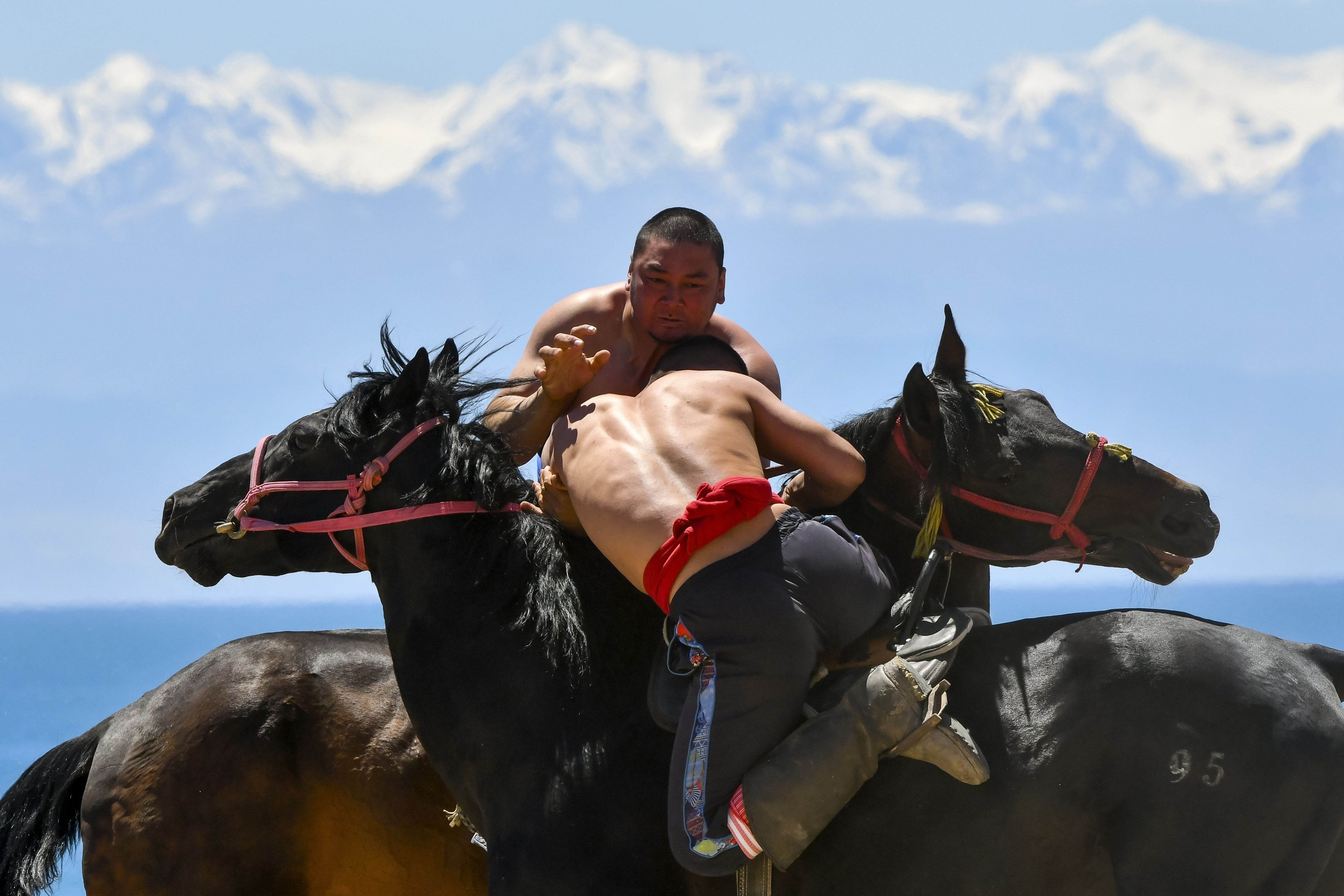 Kyrgyz horse riders compete during a kok boru, also called ulak tartysh, a traditional game in which players on horseback manoeuvre with a goat's carcass and score by putting it into the opponents' goal outside Bosteri village, 202 km, (126 miles) southeast of Bishkek, in the Issyk-Kul Region of Kyrgyzstan, Saturday, June 1, 2024. (Photo by Vladimir Voronin/AP Photo)