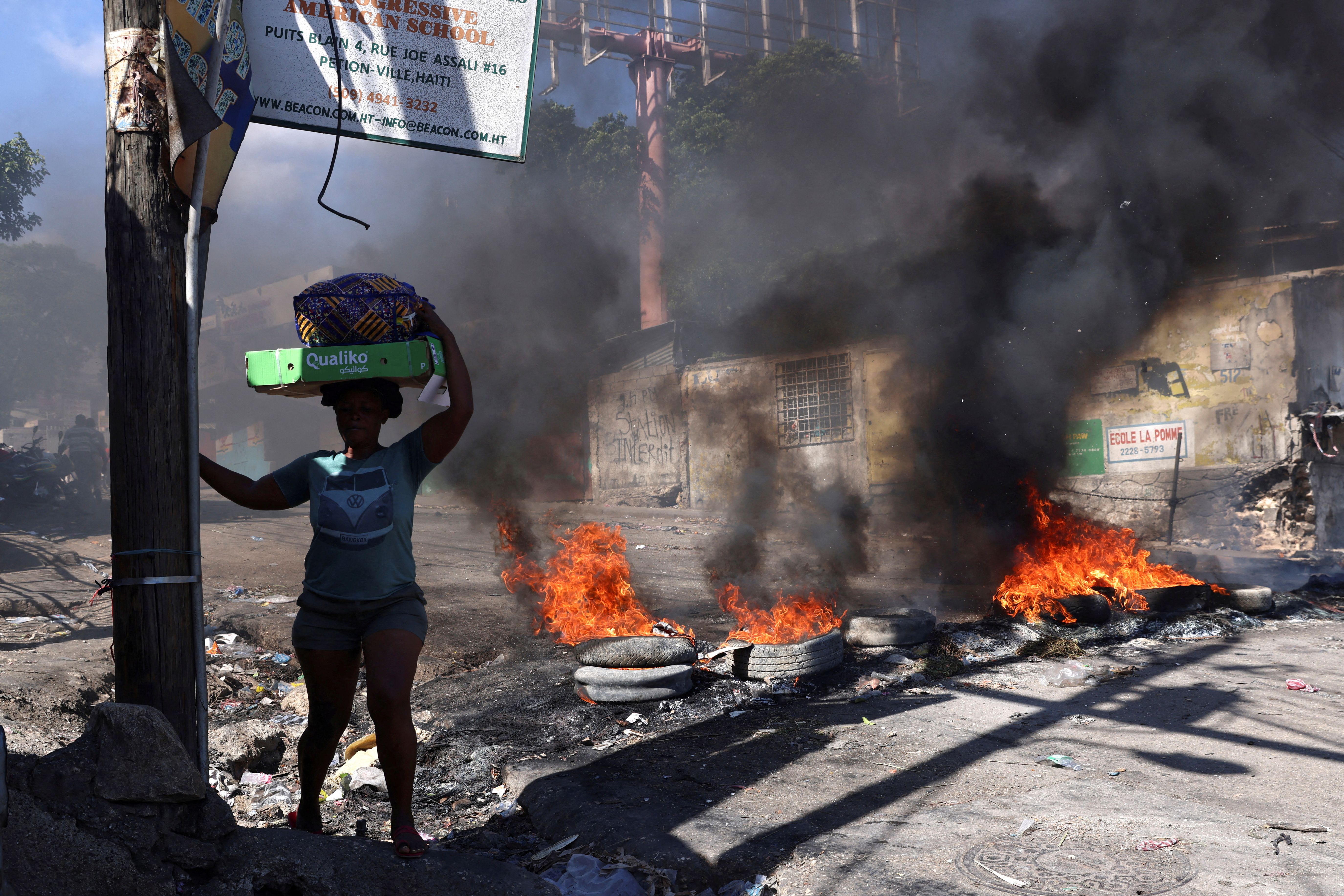 A woman walks past a burning barricade set during a protest against insecurity, in the Petion-Ville neighborhood of Port-au-Prince, Haiti on April 2, 2025. (Photo by Ralph Tedy Erol/Reuters)