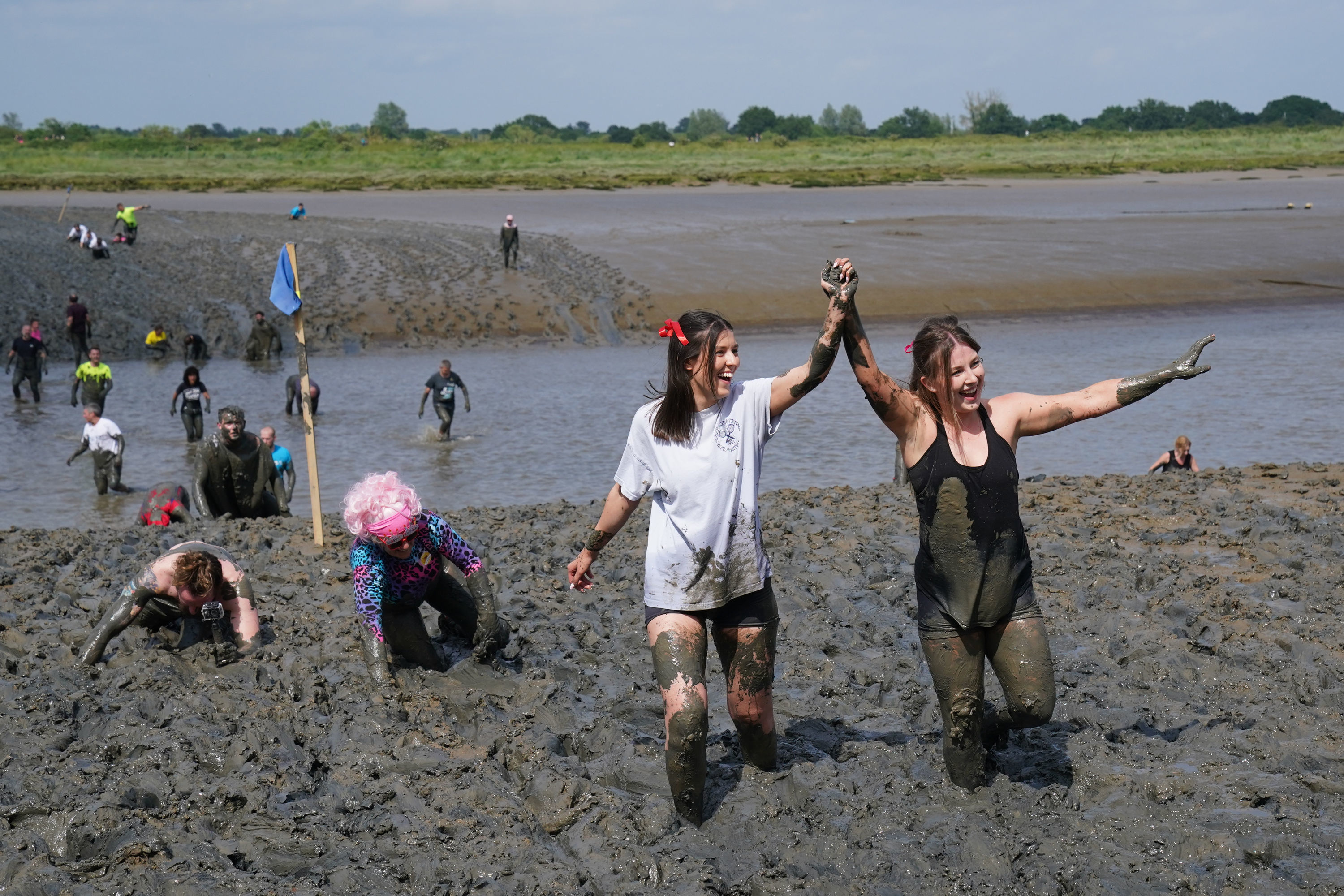Competitors take part in the annual Maldon Mud Race, a charity event to race across the bed of the River Blackwater in Essex, UK on June 2, 2024. The race originated in 1973, with a dare being given by a local resident to the landlord of the Queens Head public house, which stands on the Hythe Quay in Maldon, challenging him to serve a meal on the saltings of the Rivers Blackwater dressed in a dinner jacket. The challenge was accepted and carried out, resulting next year in a bar being opened on the saltings. (Photo by Gareth Fuller/PA Images via Getty Images)
