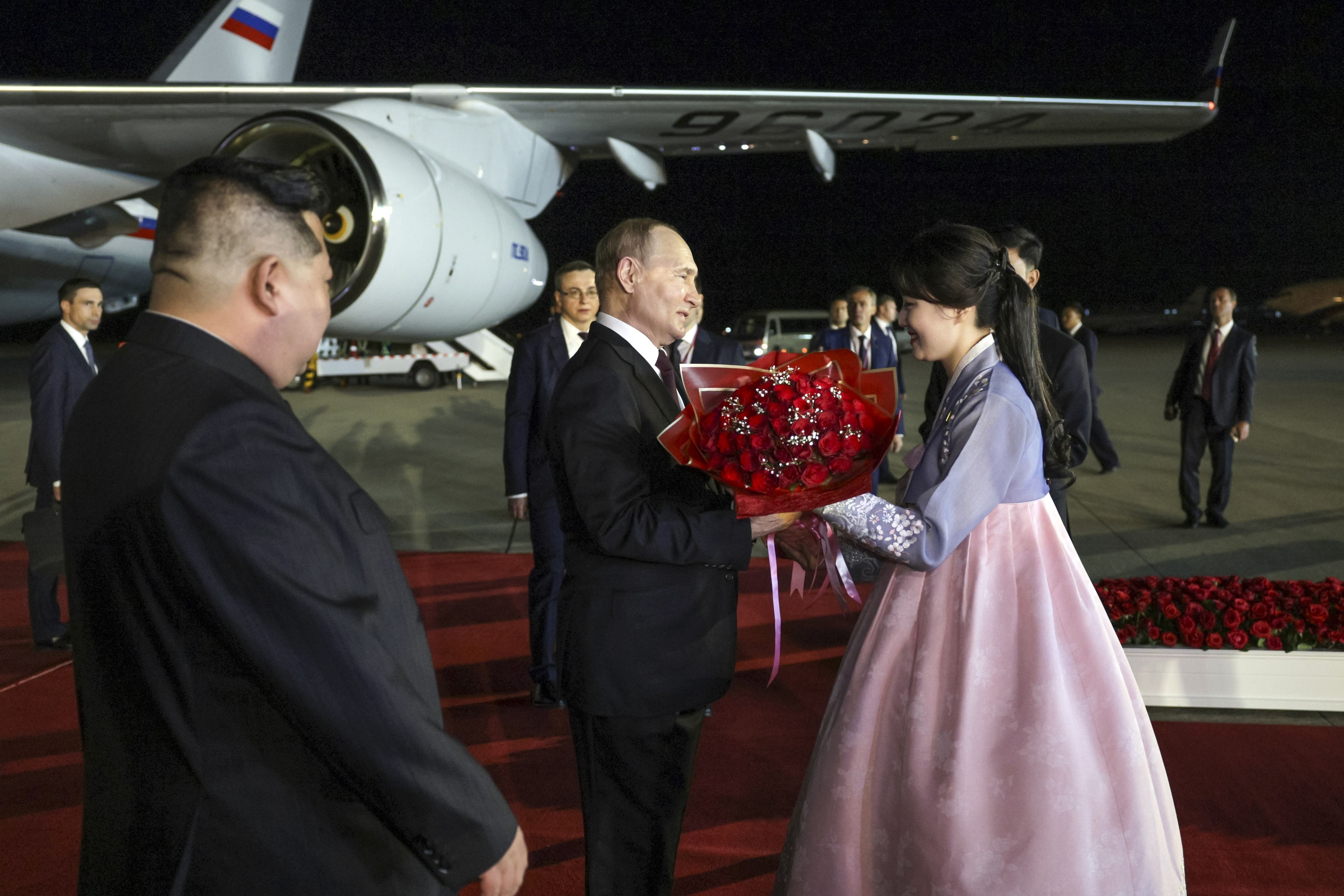 Russian President Vladimir Putin, center, is welcomed upon his arrival as North Korea's leader Kim Jong Un, back to a camera, stands near at the Pyongyang Sunan International Airport outside Pyongyang, North Korea, on Tuesday, June 18, 2024. (Photo by Gavriil Grigorov, Sputnik, Kremlin Pool Photo via AP Photo)