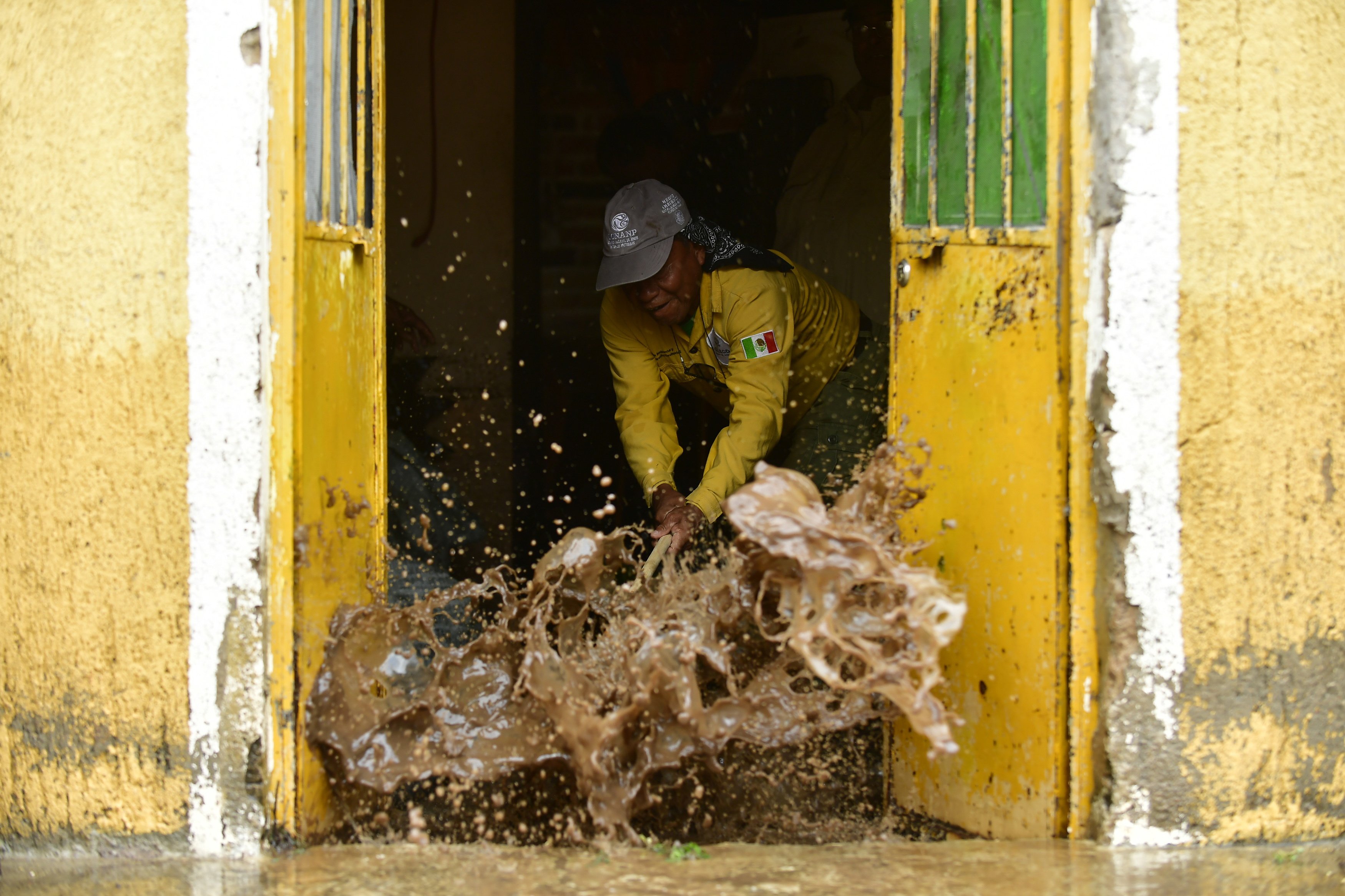A person removes water from a house during floods caused by the overflowing of the Tagus River in the municipality of Tototlan, Mexico, 29 September 2025. (Photo by Francisco Guasco/EPA)