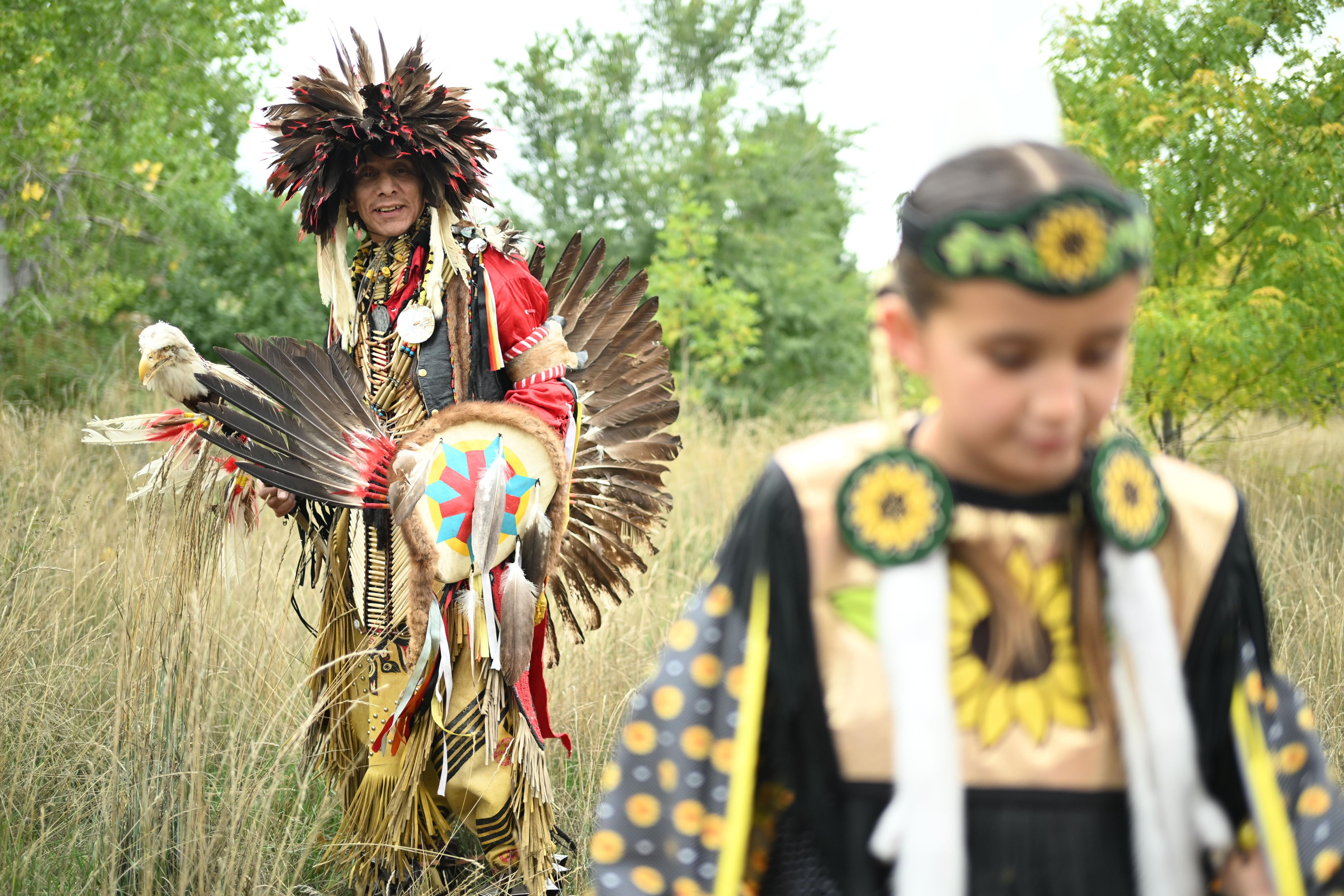Thomas Yellow Horse Davis prepares to dance during a ceremony at Indigenous Peoples' Day on October 13, 2025 in Denver, Colorado. Denver passed legislation this year to honor Indigenous People's Day, rather than Columbus Day, as a paid city holiday, and today is the first observance of this day, featuring Coloradan Indigenous ceremonies, traditional dances, and musical performances. (Photo by Mark Makela/Getty Images)