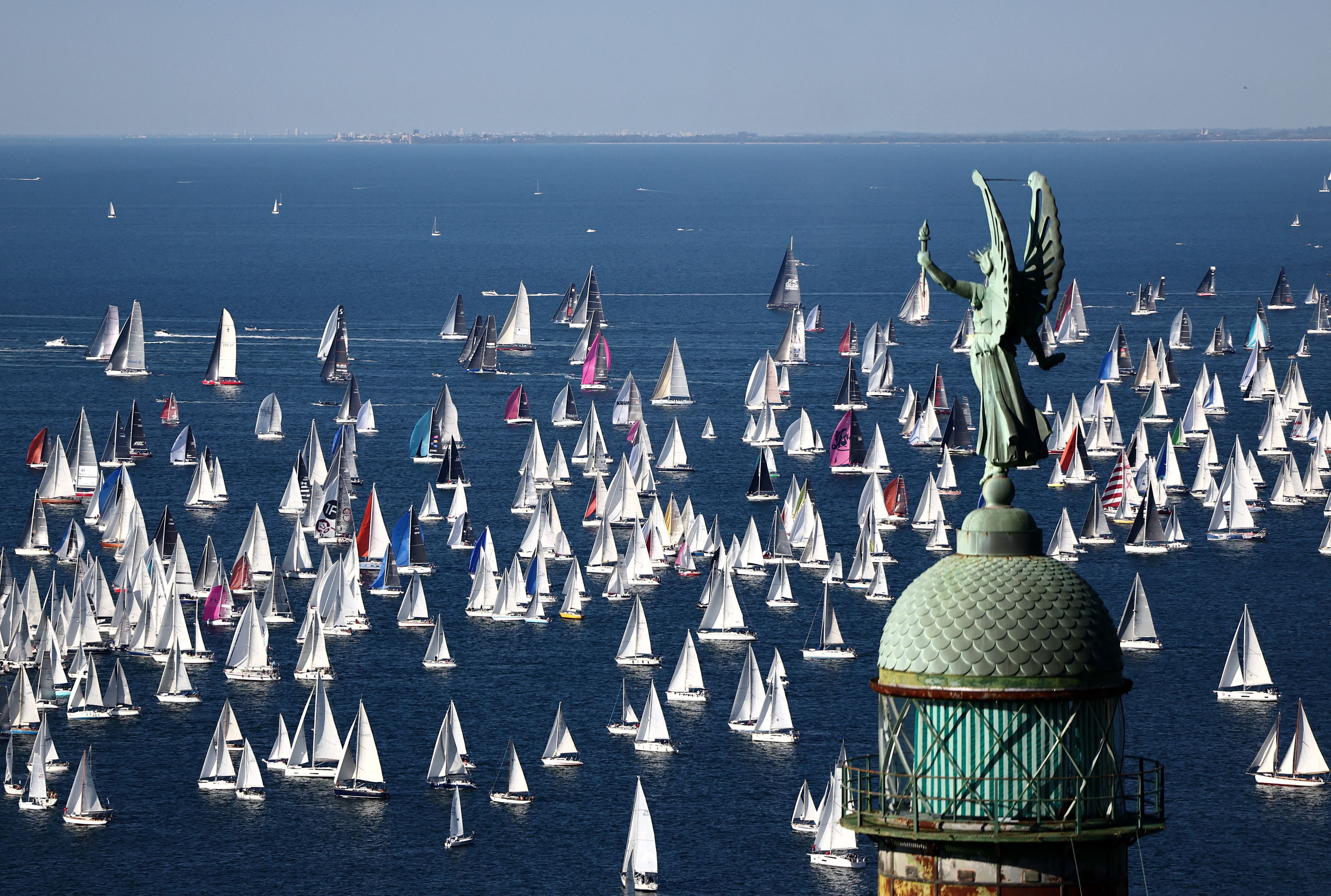 The Victory Lighthouse in Trieste, Italy, overlooks boats taking part in the Barcolana, the world’s largest sailing regatta on October 12, 2025. (Photo by Yara Nardi/Reuters)