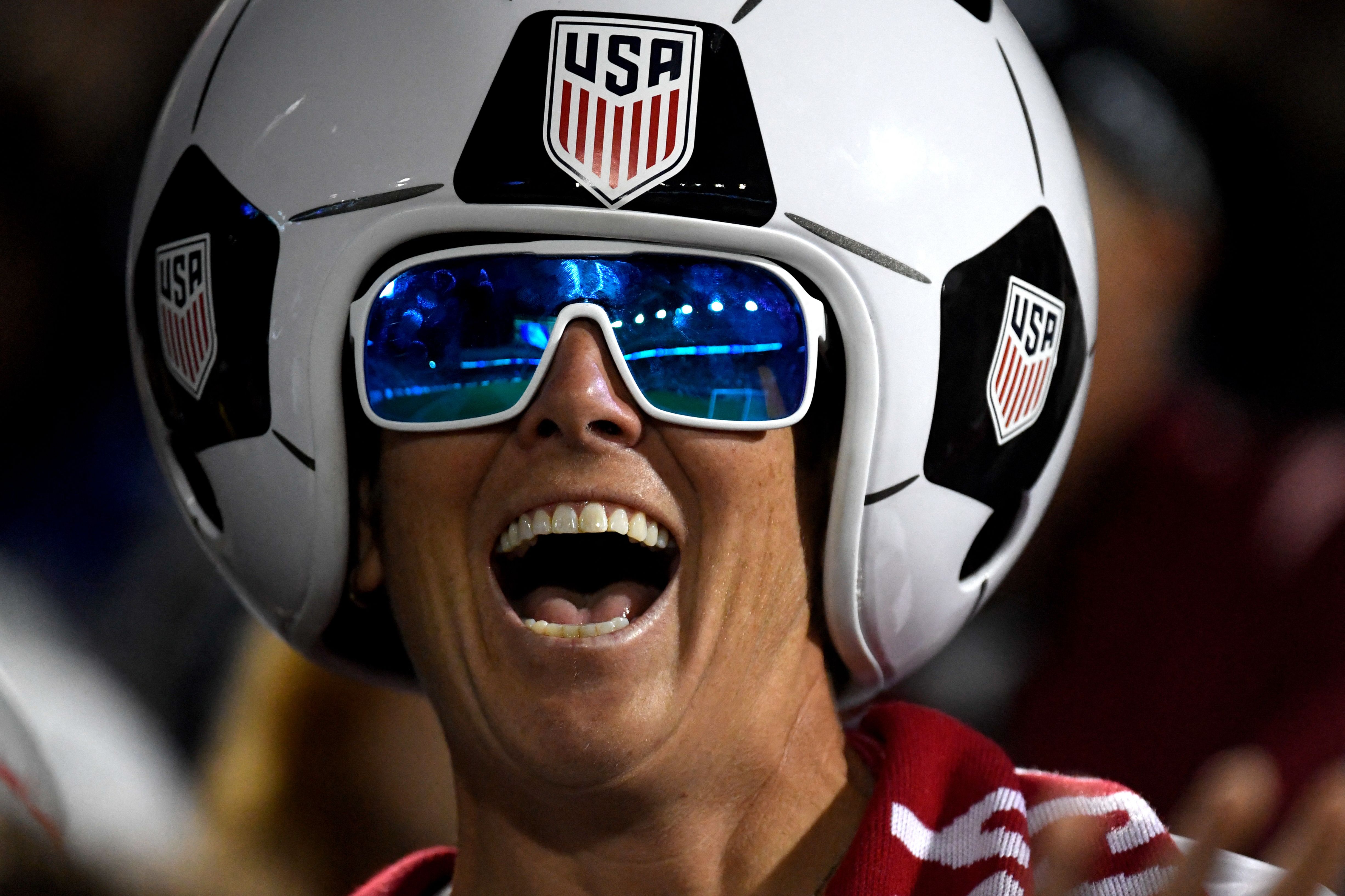 A team USA fan wears a giant soccer ball helmet during the international friendly football match between USA and Australia at Dick's Sporting Goods Park in Commerce City, Colorado, on October 14, 2025. (Photo by Jason Connolly/AFP Photo)