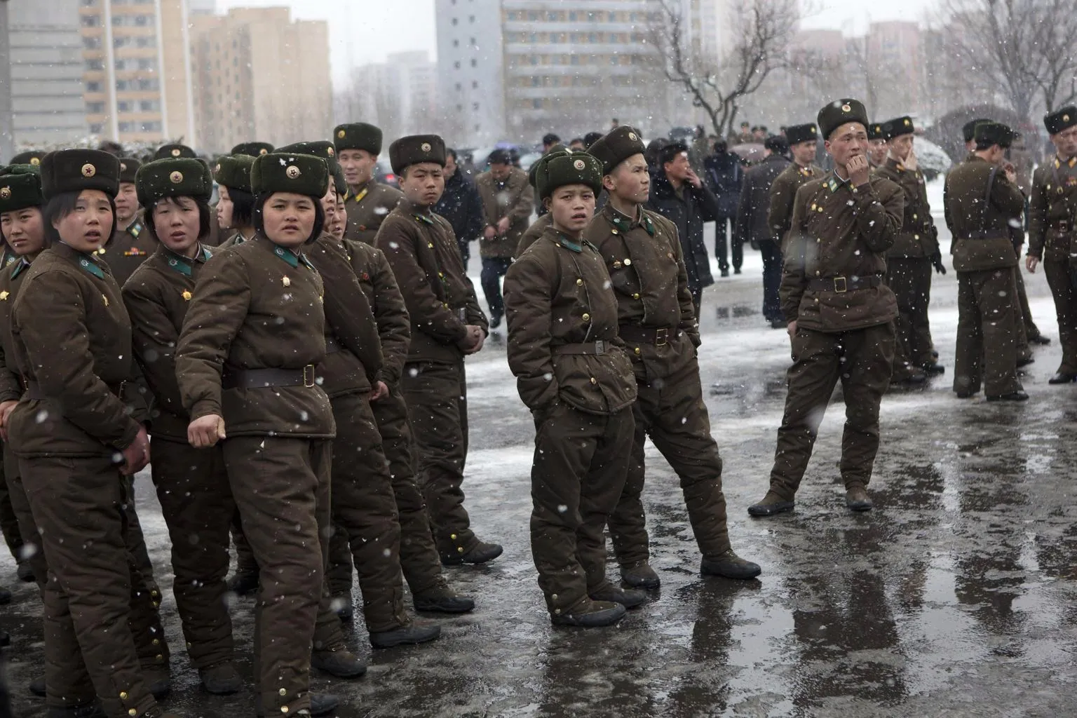 North Korean soldiers gather along a Pyongyang street during heavy snowfall on Sunday, February 17, 2013. (Photo by David Guttenfelder/AP Photo)