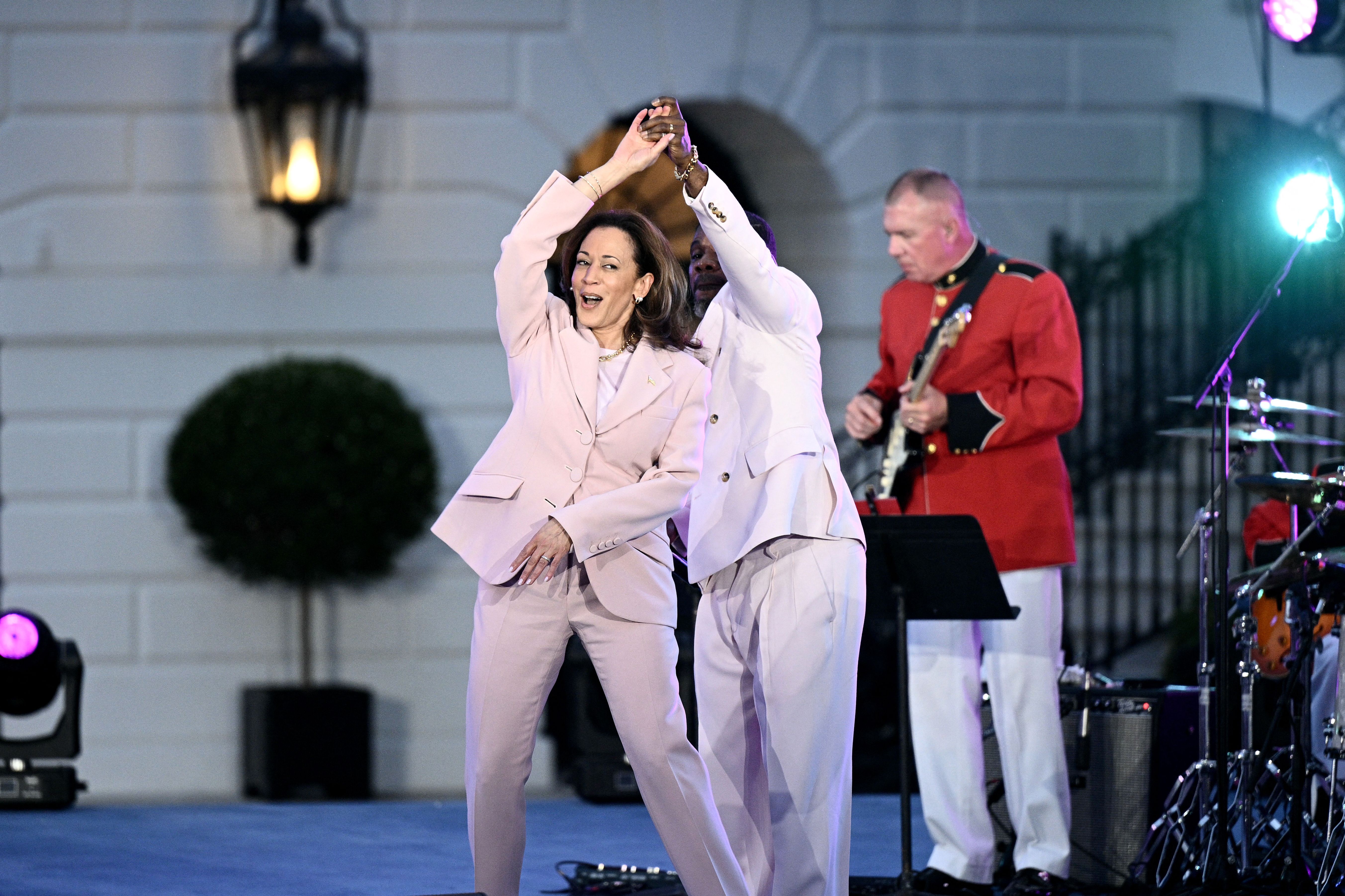 US Vice President Kamala Harris dances with US singer Kirk Franklin during a Juneteenth Concert in the South Lawn of the White House in Washington, DC on June 10, 2024. (Photo by Brendan Smialowski/AFP Photo)