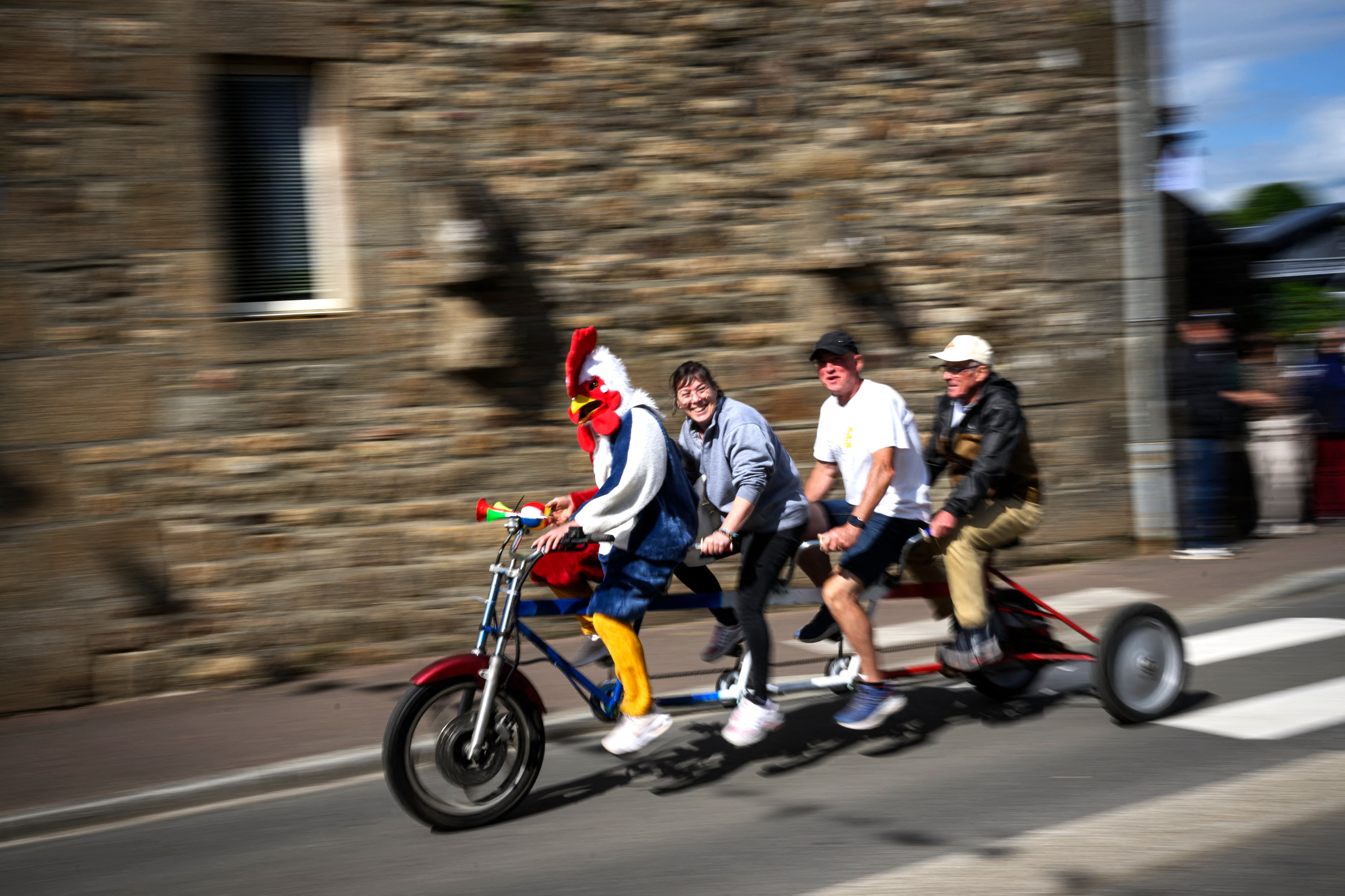 A supporter dressed like a rooster rides with friends on the sidelines of the Elit road women French championships cycling race, in Saint-Martin-de-Landelles, western France, on June 22, 2024. (Photo by Loic Venance/AFP Photo)