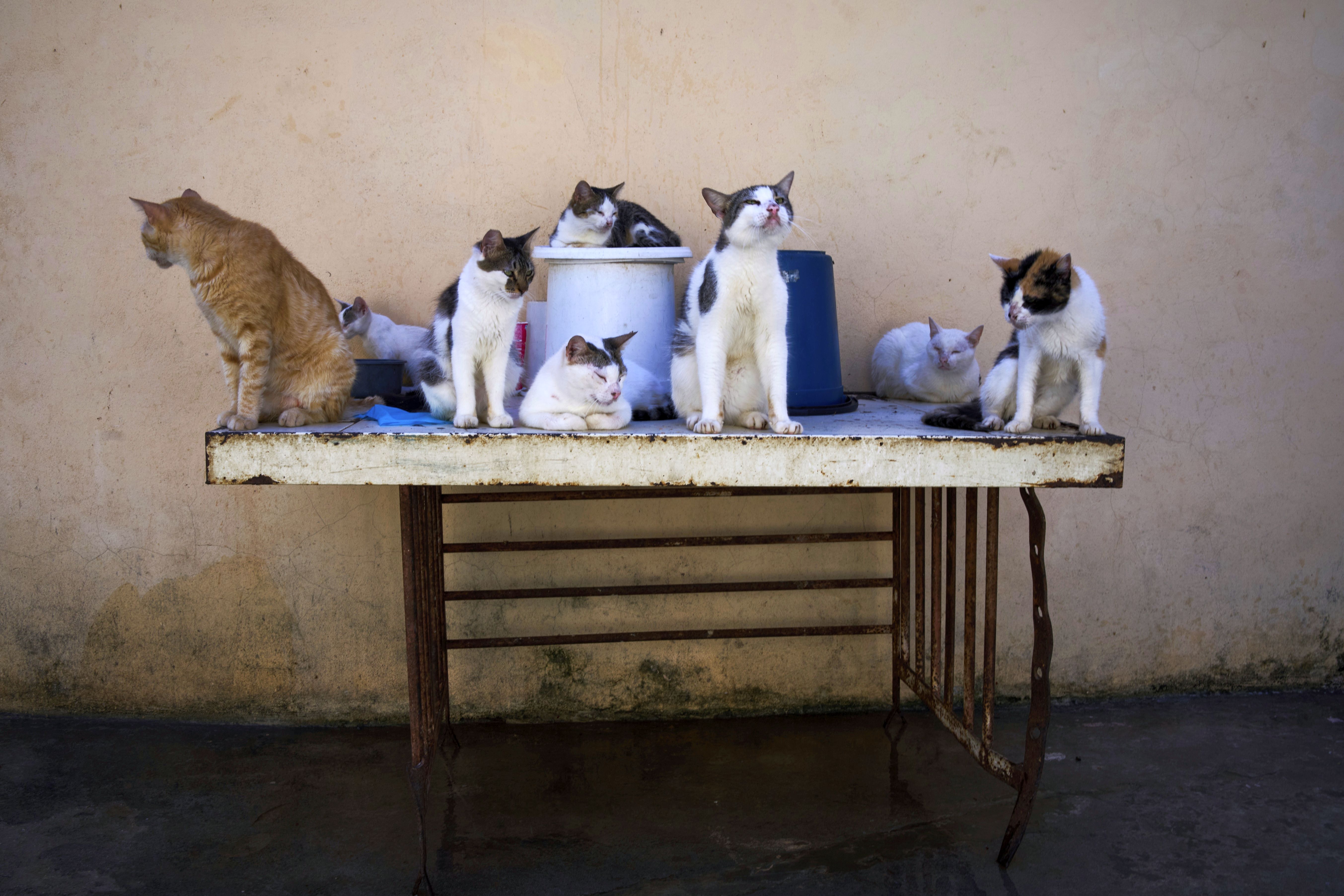 Stray cats gather on a table at the protected cat colony “Proyecto Aldameros”, in a park in the historic area of Havana, Tuesday, August 5, 2025. (Photo by Ramon Espinosa/AP Photo)
