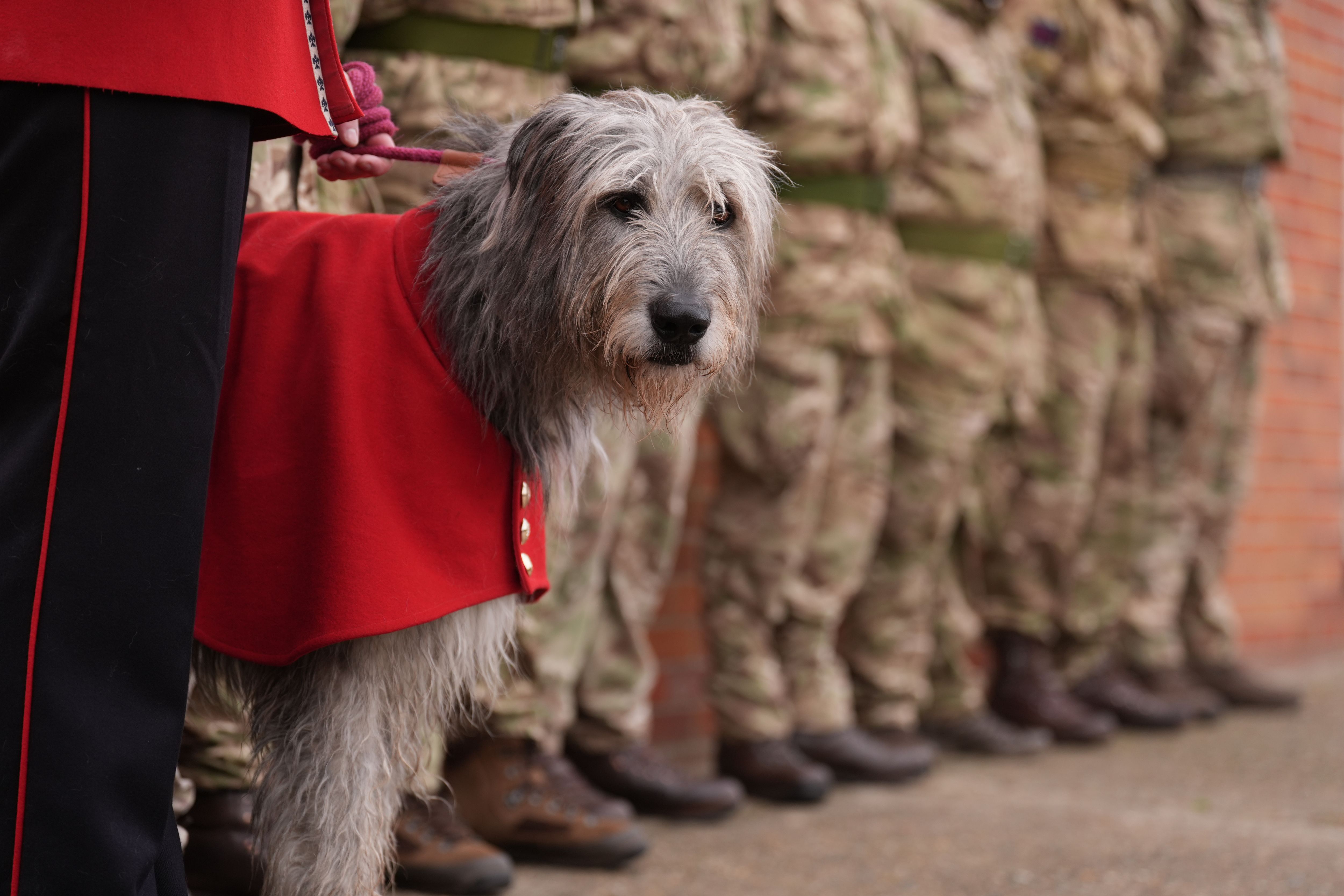Seamus, a mascot of the Irish Guards stands during a farewell parade for Ukrainian soldiers at a British army training camp in the East of England, where they have been undergoing combat training with the Irish Guards as part of the UK-led Operation Interflex on Wednesday, October 15, 2025. (Photo by Joe Giddens/PA Images via Getty Images)