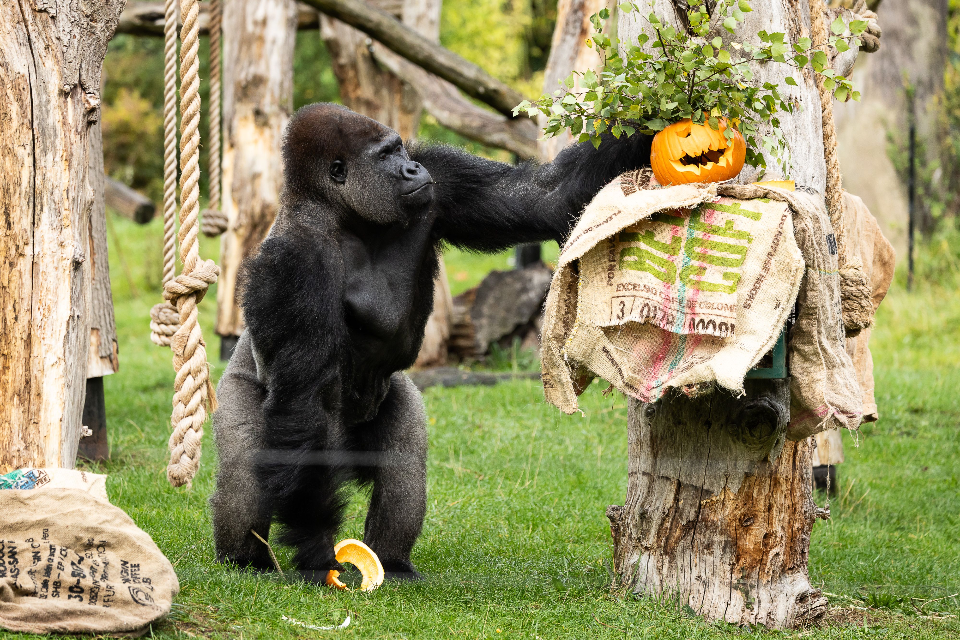 Venus, a baby gorilla, gets into the Halloween spirit at London Zoo on October 22, 2025. (Photo by ZSL London Zoo/Cover Images)