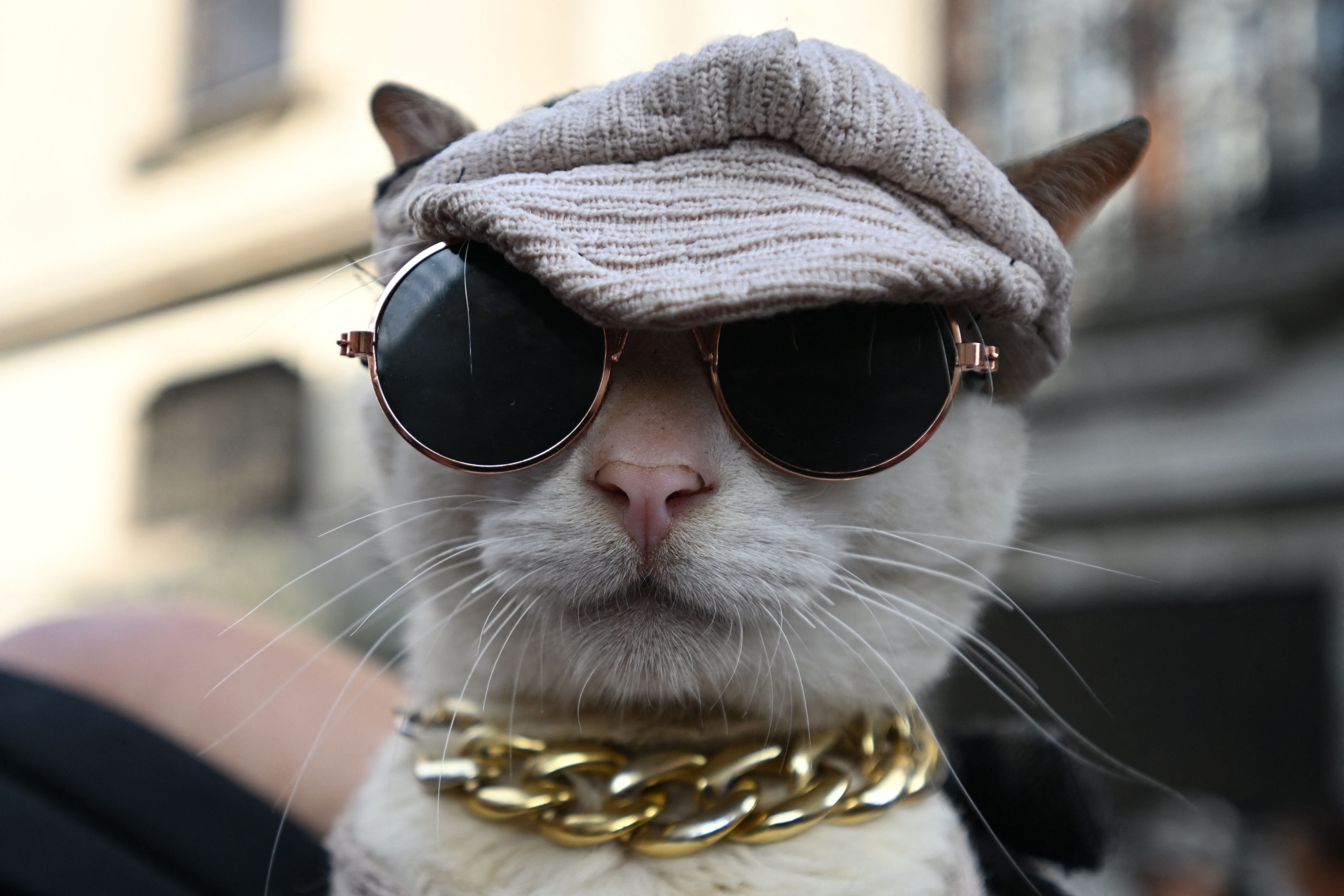 A cat using glasses and a hat is pictured in Lima on October 19, 2025. (Photo by Raul Arboleda/AFP Photo)