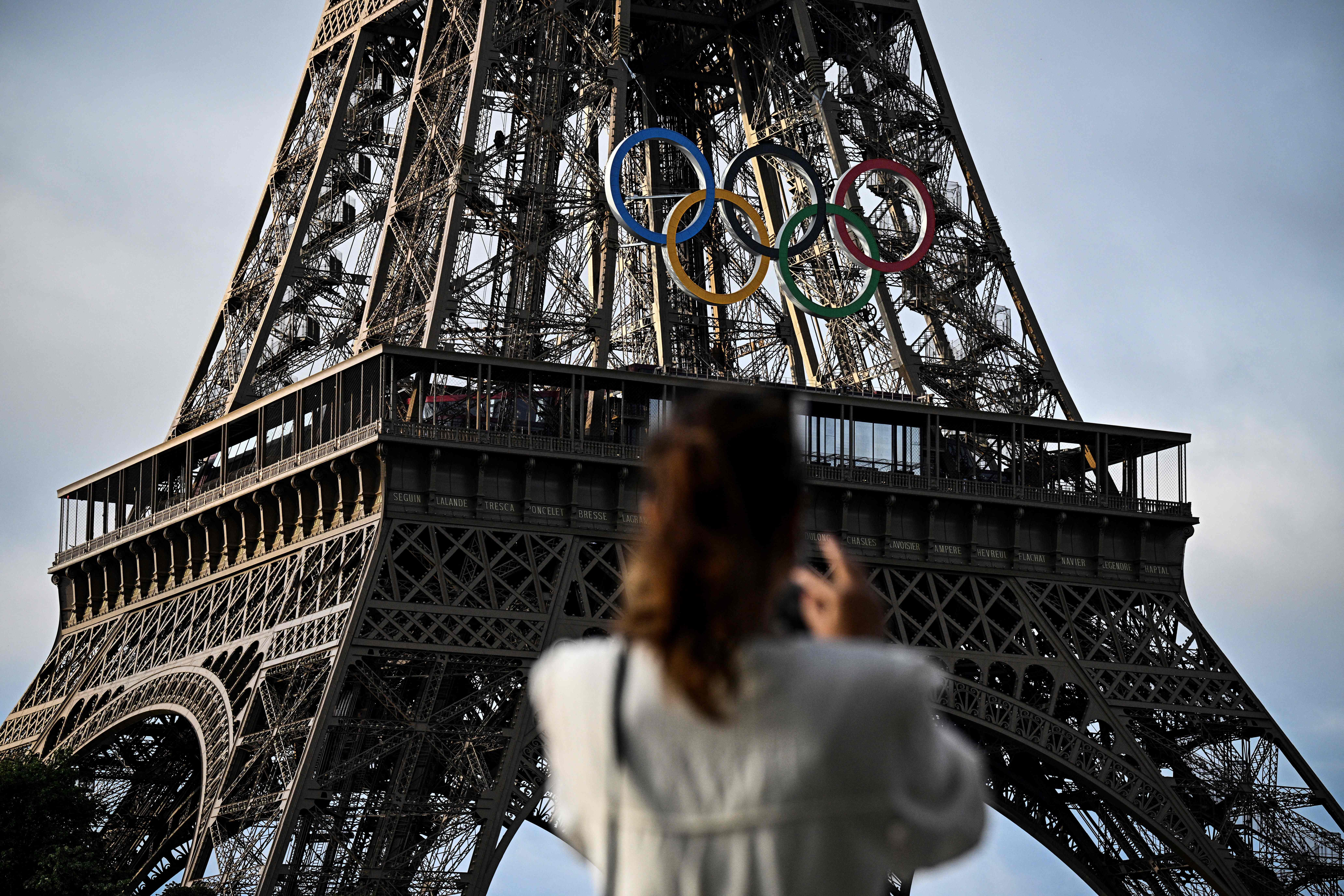 A woman takes a picture of the Eiffel Tower decorated with the Olympic rings for the upcoming Paris 2024 Olympic Games, in Paris, on June 17, 2024. (Photo by Julien de Rosa/AFP Photo)