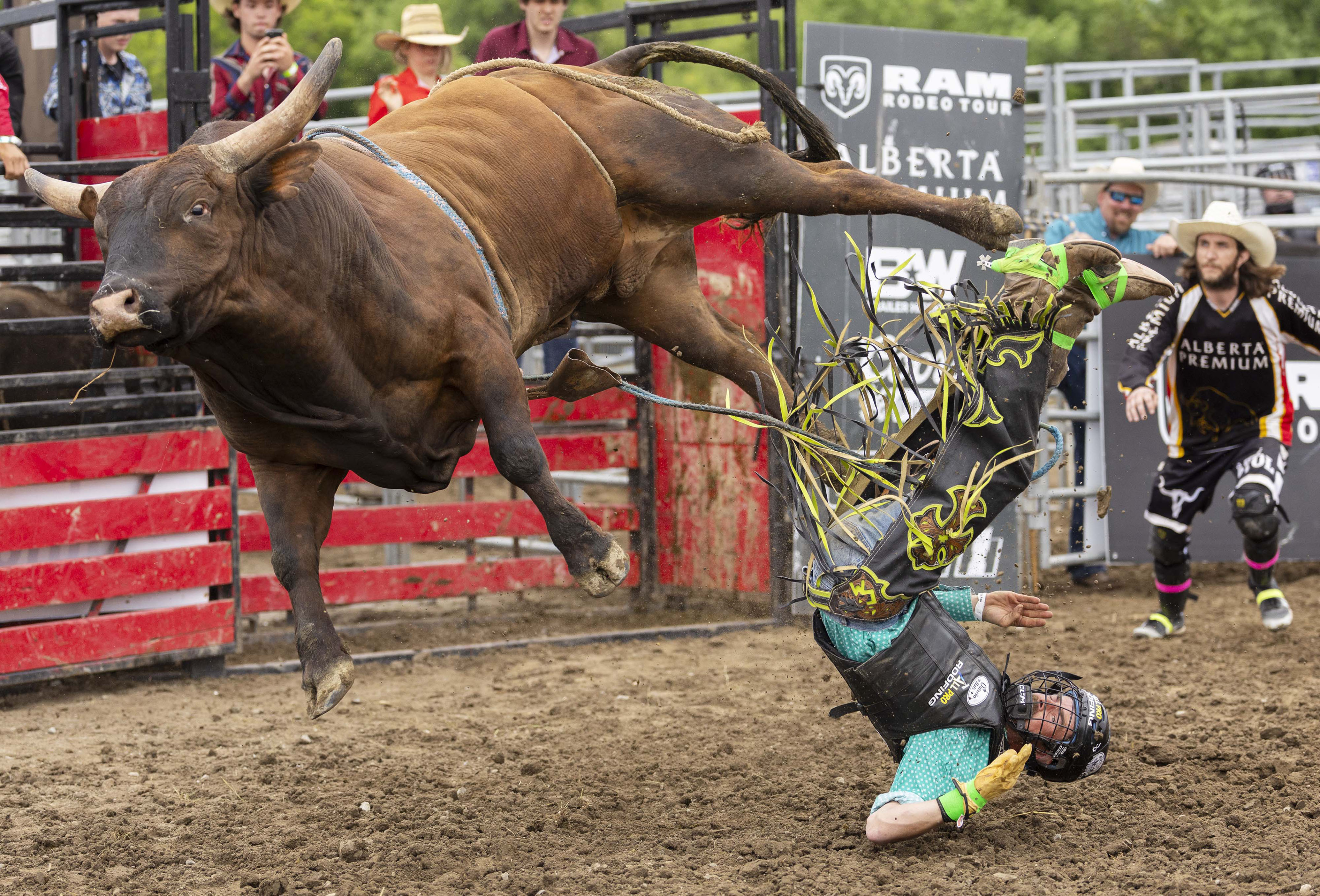 A cowboy falls in the bull riding event at the 2024 RAM Rodeo Tour in Brooklin, Ontario, Canada, on June 2, 2024. (Photo by Zou Zheng/Xinhua News Agency)