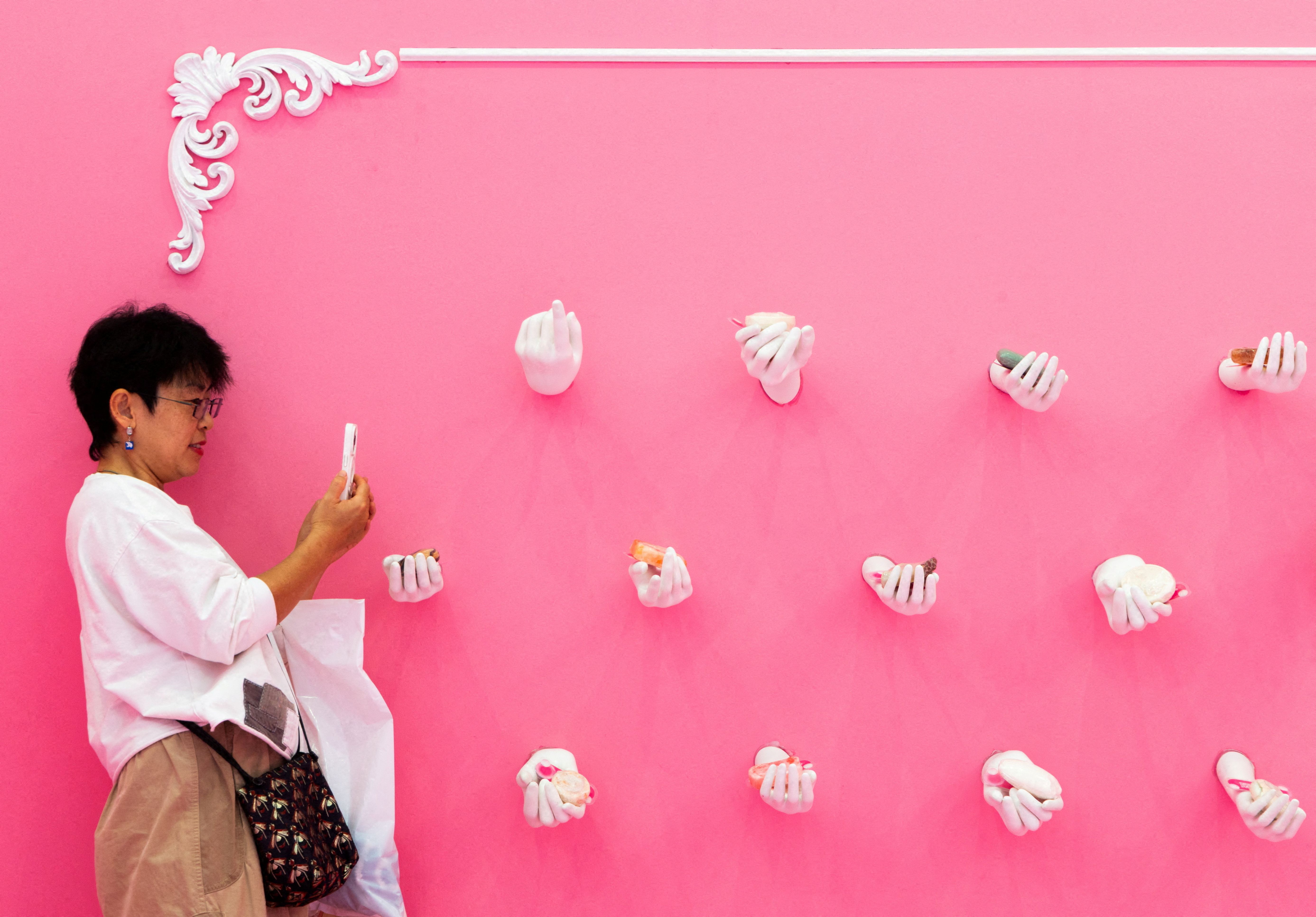 A woman takes a photo of sculpted hands holding pieces of soap at the JD Global Soap Museum, part of the 798 Art District in Beijing, China on October 7, 2025. (Photo by Maxim Shemetov/Reuters)