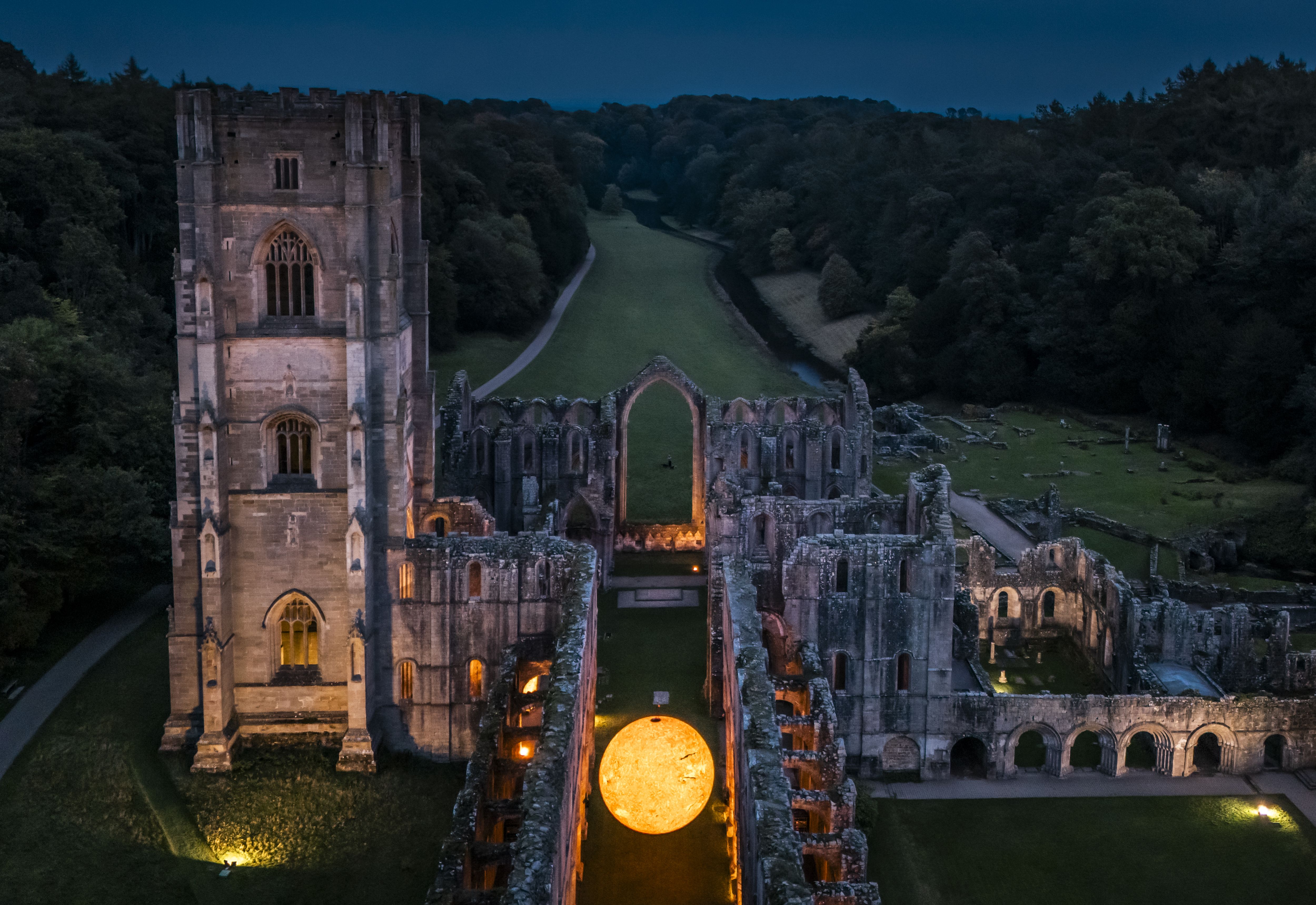 Helios, a seven-metre sun sculpture and soundscape by Luke Jerram, is suspended in the nave of the floodlit abbey ruins of Fountains Abbey, near Aldfield, Ripon in North Yorkshire, UK on Thursday, October 2, 2025. (Photo by Danny Lawson/PA Images via Getty Images)