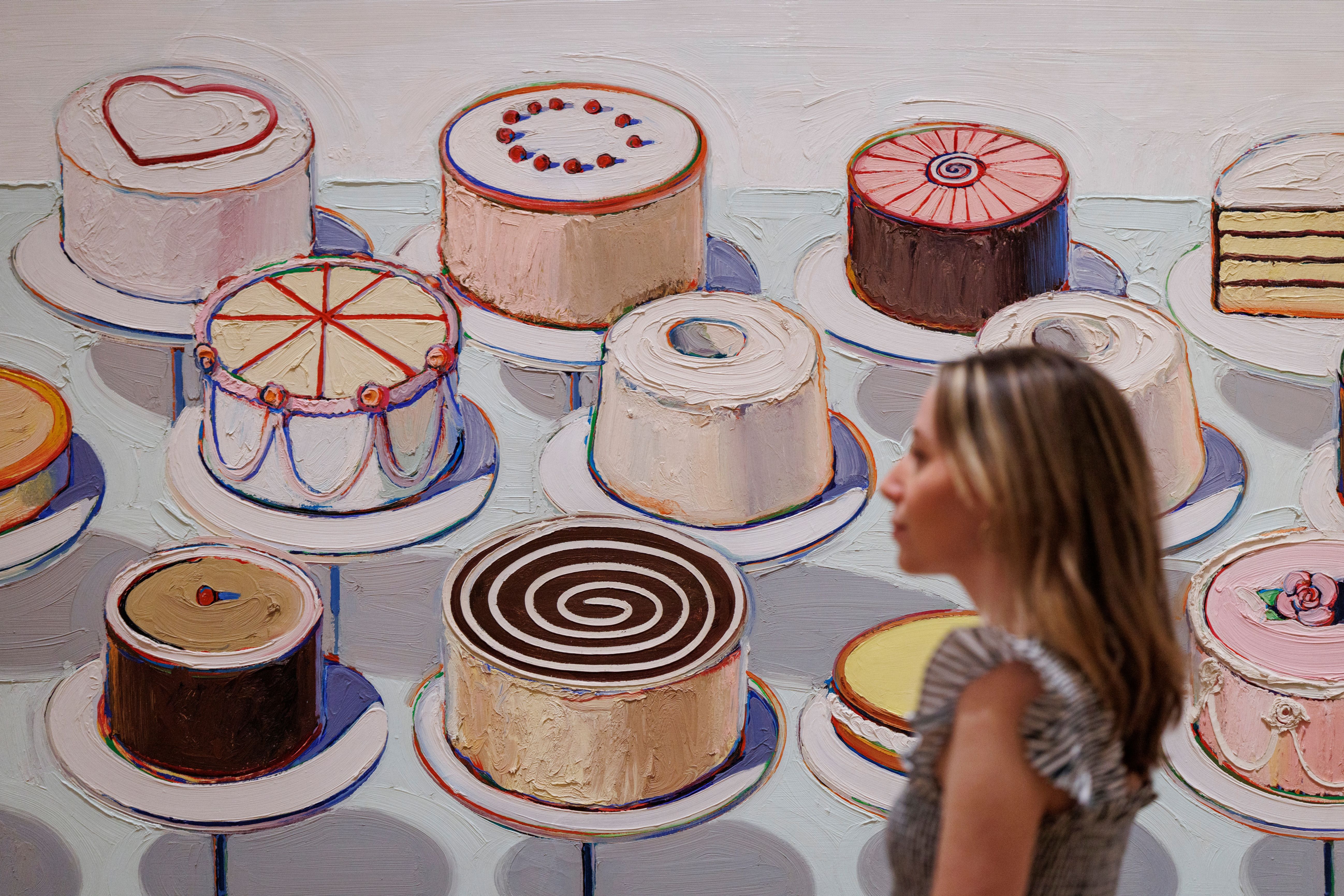 A gallery staff poses with a painting titled “Cakes” by US painter Wayne Thiebaud during a press preview of “Wayne Thiebaud. American Still Life” exhibition at The Courtauld Gallery of Somerset House in London, Britain, 09 October 2025. Wayne Thiebaud's paintings will be displayed in the UK for the first time from 10 October 2025 to 18 January 2026. (Photo by Tolga Akmen/EPA)