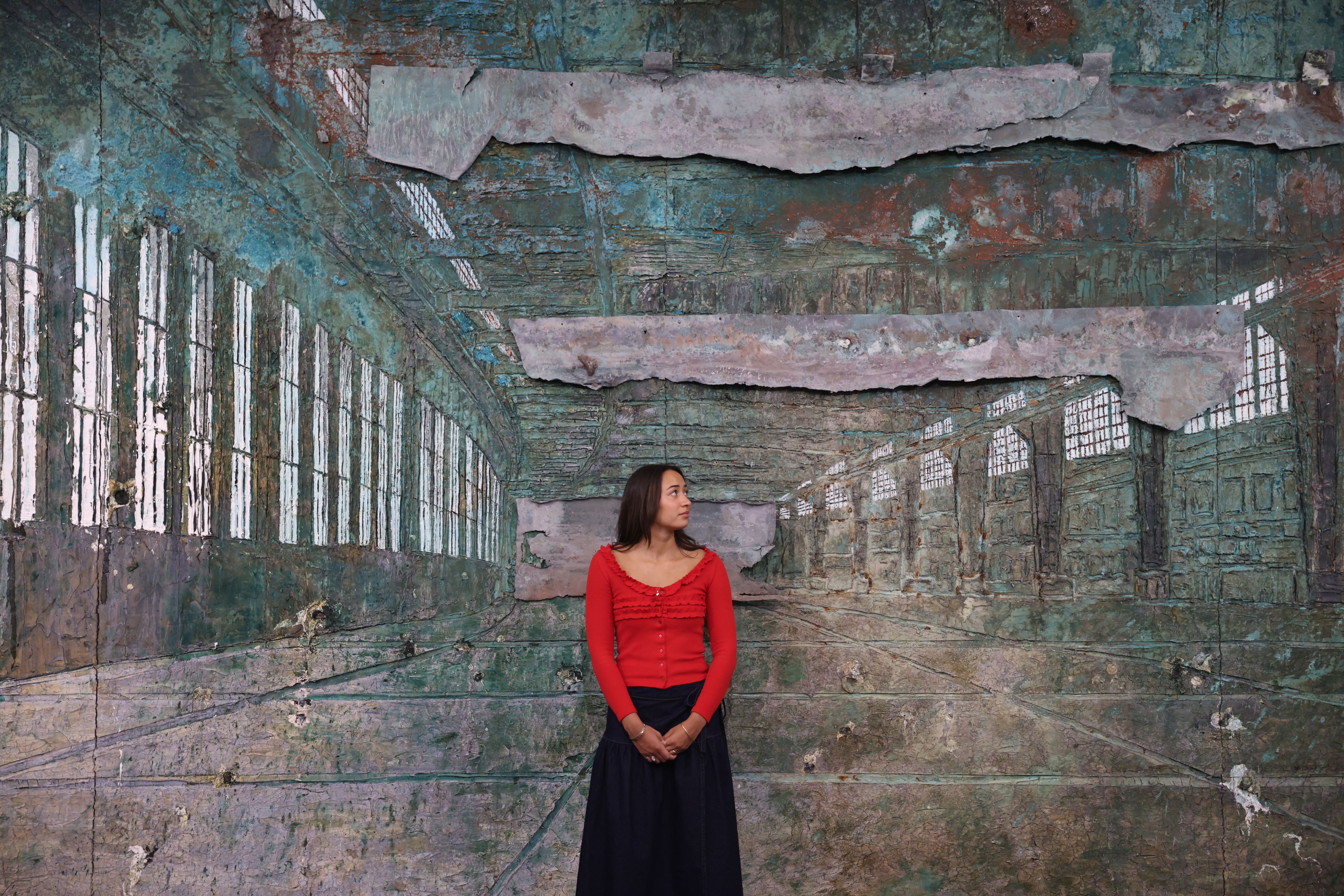 A gallery assistant poses with the work “Tempelhof” by German artist Anslem Kiefer during a preview of Frieze Week offerings at Sotheby's auction house in London, Britain, 10 October 2025. The preview of the works will be on display to the public until 16 October. (Photo by Neil Hall/EPA)