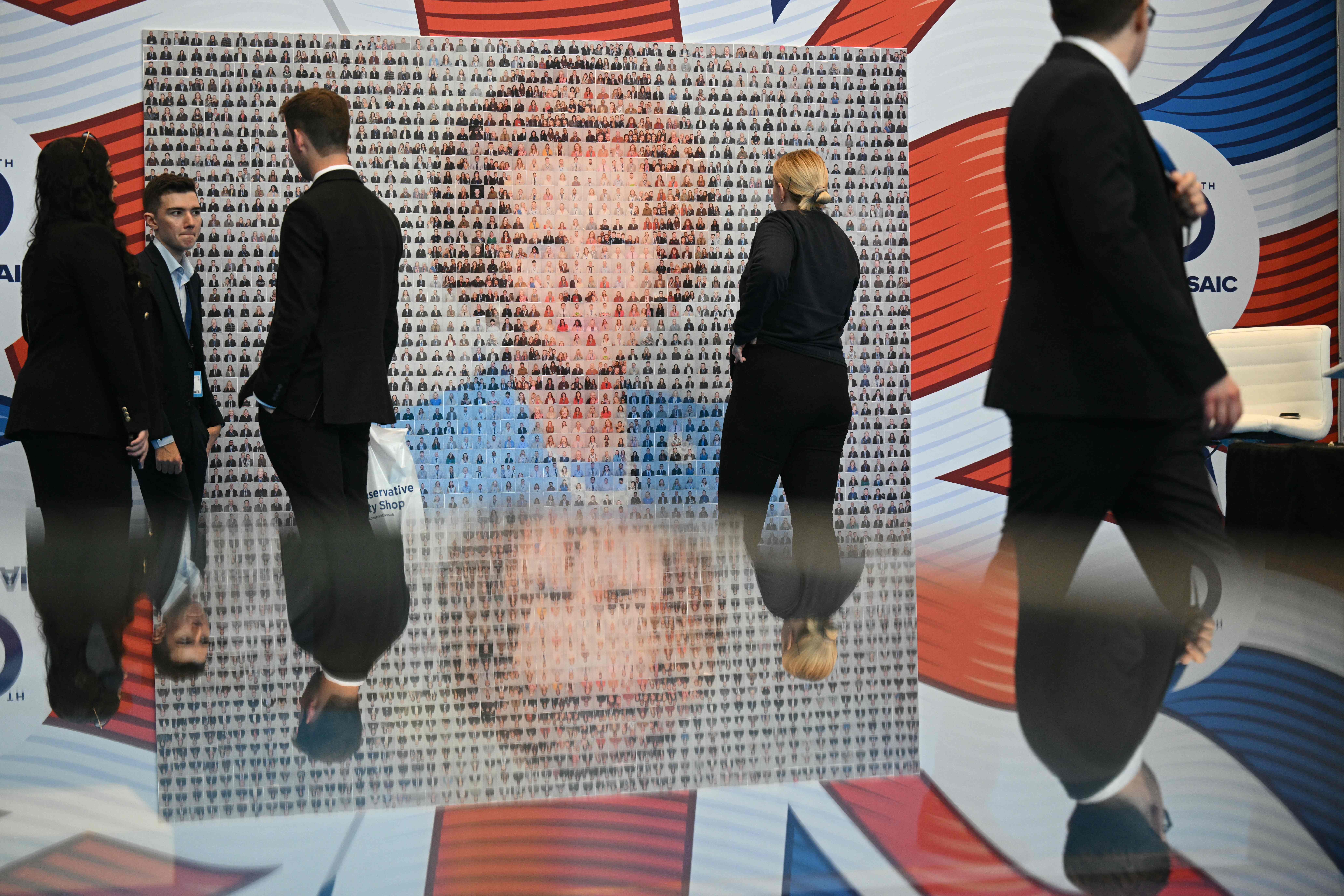 Delegates look at a montage creating an image of former Conservative prime minister Margaret Thatcher on the third day of the annual Conservative Party conference in Manchester, north-west England, on October 7, 2025. (Photo by Oli Scarff/AFP Photo)