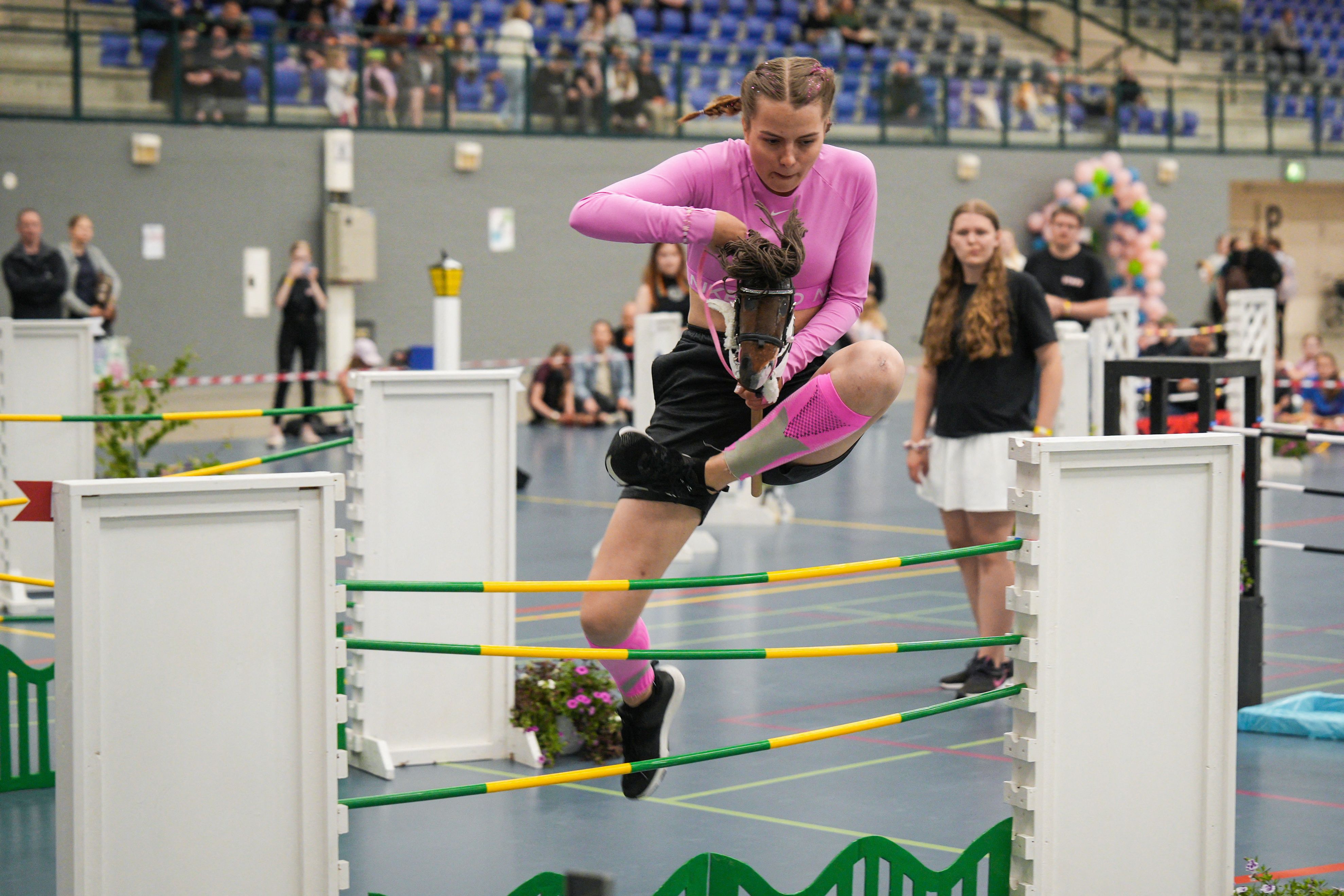 A participant competes in the show jumping category of the Finnish Hobbyhorse Championships 2024 at the local sport arena in Seinäjoki, Finland on June 15, 2024. The world's biggest hobby horse event organised in Finland is seeing more devotees every year despite ridiculing attitudes surrounding the hobby which might seem odd at a first glance. Hobby horsing initially sprung out of Finland as a phenomenon over 10 years ago and has since gathered an increasing number of enthusiasts in the Nordic country and abroad. (Photo by Alessandro Rampazzo/AFP Photo)