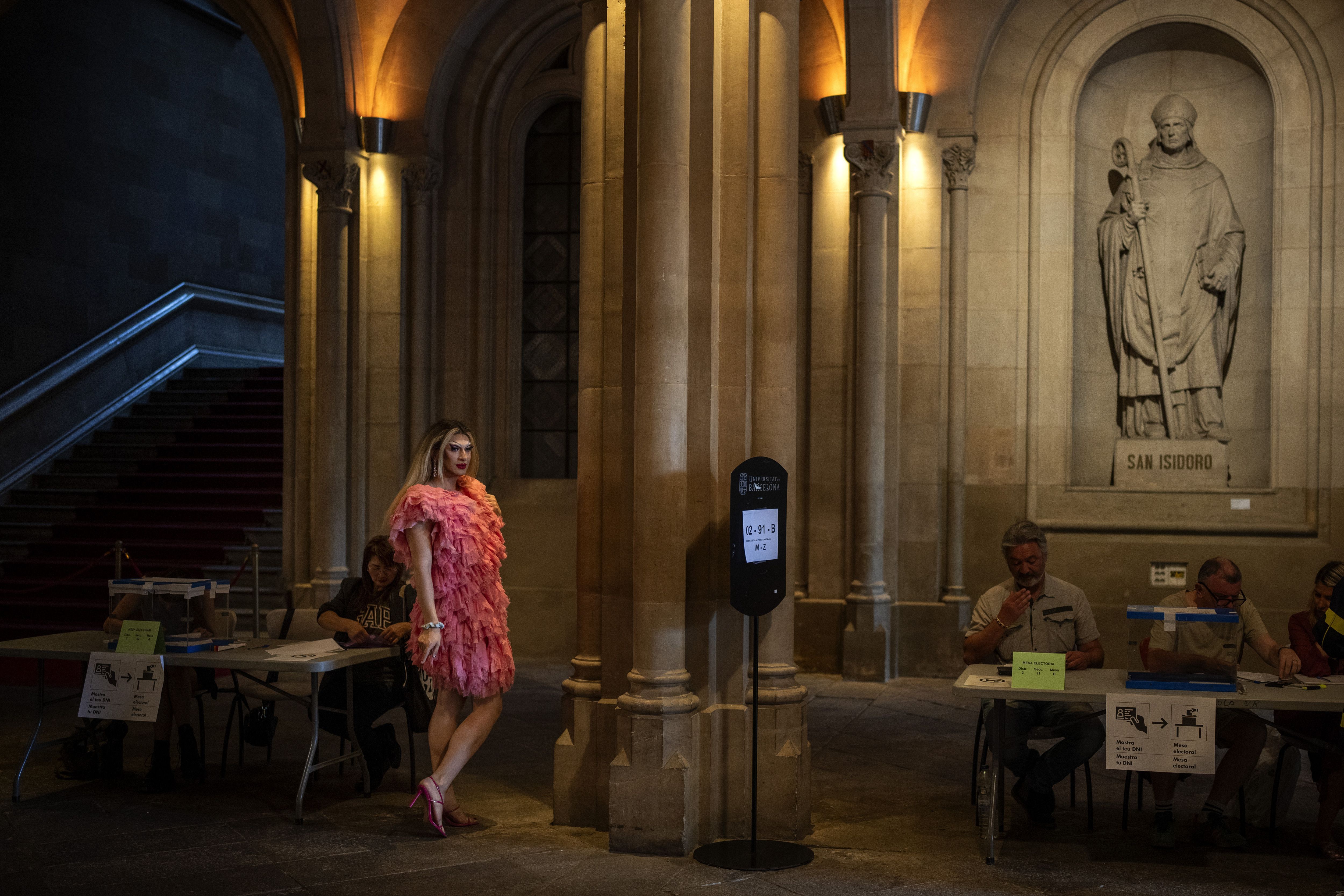 Drag queen Bernat Bodes, known as Pitita, left, takes a break from her duties as president of a polling station during the European Parliament elections in Barcelona, Spain, Sunday, June 9, 2024. Polling stations have opened across Europe as voters from 20 countries cast ballots in elections that are expected to shift the European Union’s parliament to the right and could reshape the future direction of the world’s biggest trading bloc. (Photo by Emilio Morenatti/AP Photo)