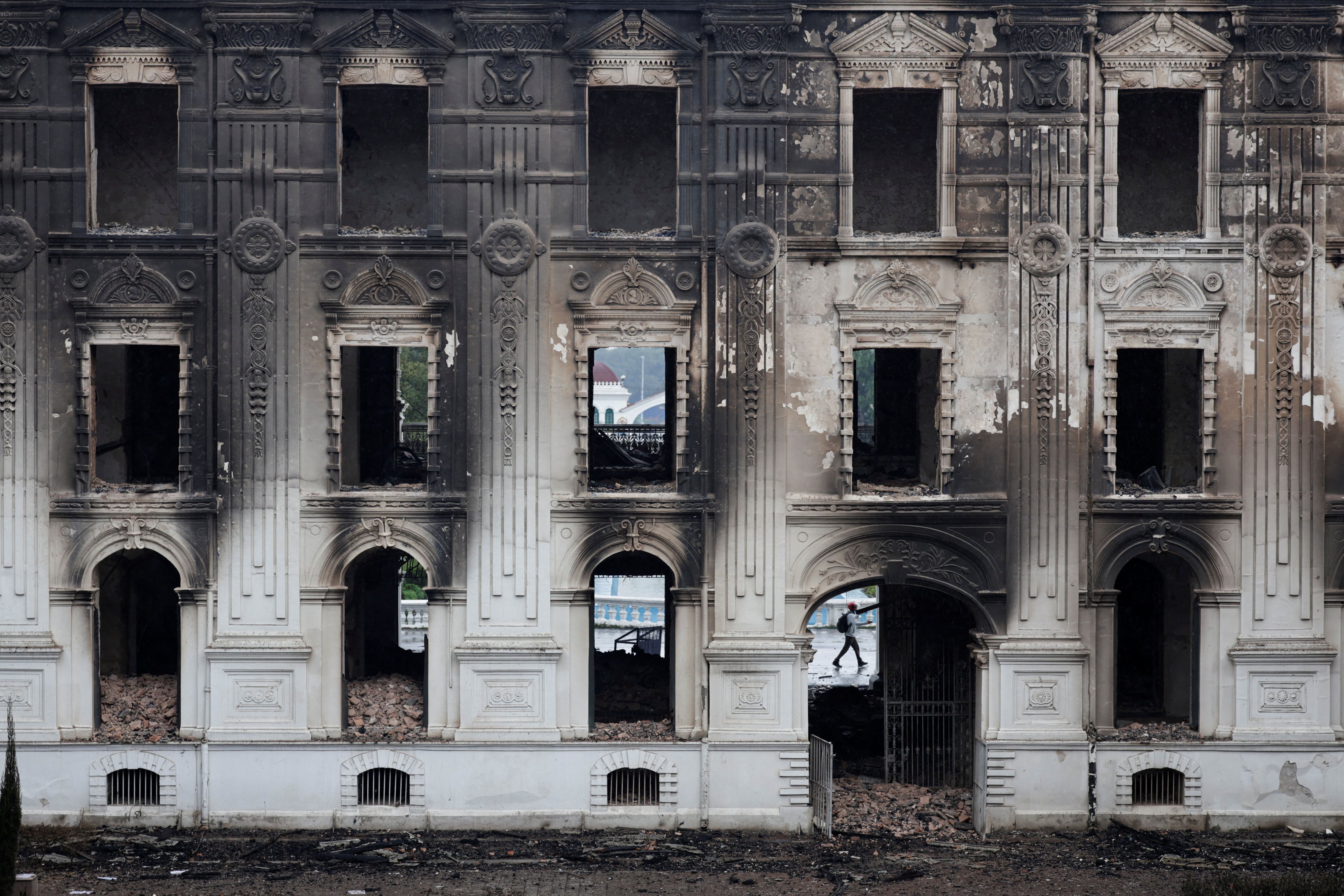 A person walks by burned Singha Durbar office complex that houses the Prime Minister's office and other ministries following Monday's deadly anti-corruption protests triggered by a social media ban, which was later lifted, in Kathmandu, Nepal, on September 11, 2025. (Photo by Navesh Chitrakar/Reuters)