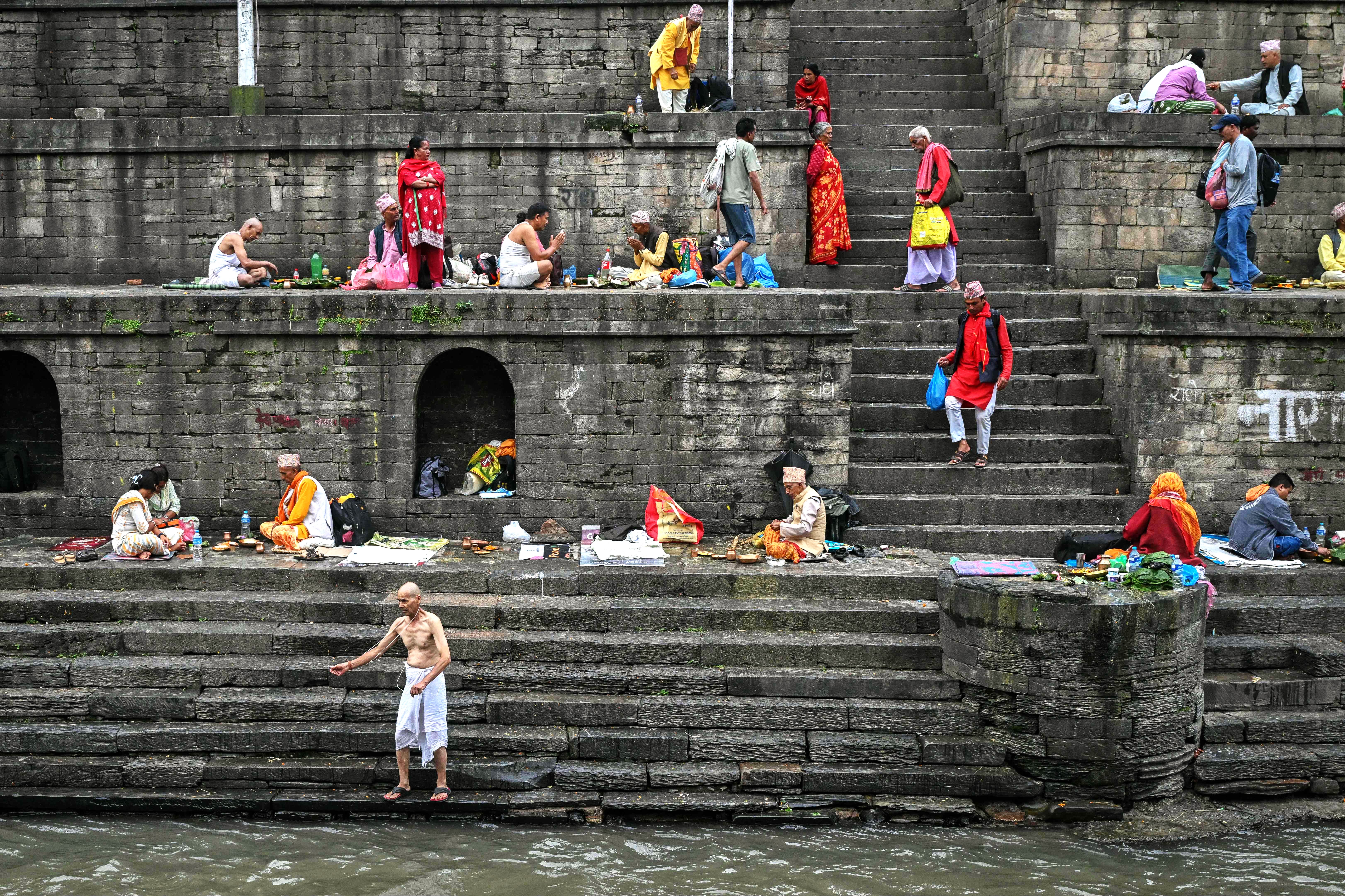 Hindu devotees perform rituals on the banks of the Bagmati River near the Pashupatinath Temple in Kathmandu on September 14, 2025. The capital Kathmandu took a step back towards normality on September 13 as a curfew was eased and daily life returned, with markets opening, traffic returning and families visiting temples. (Photo by Arun Sankar/AFP Photo)