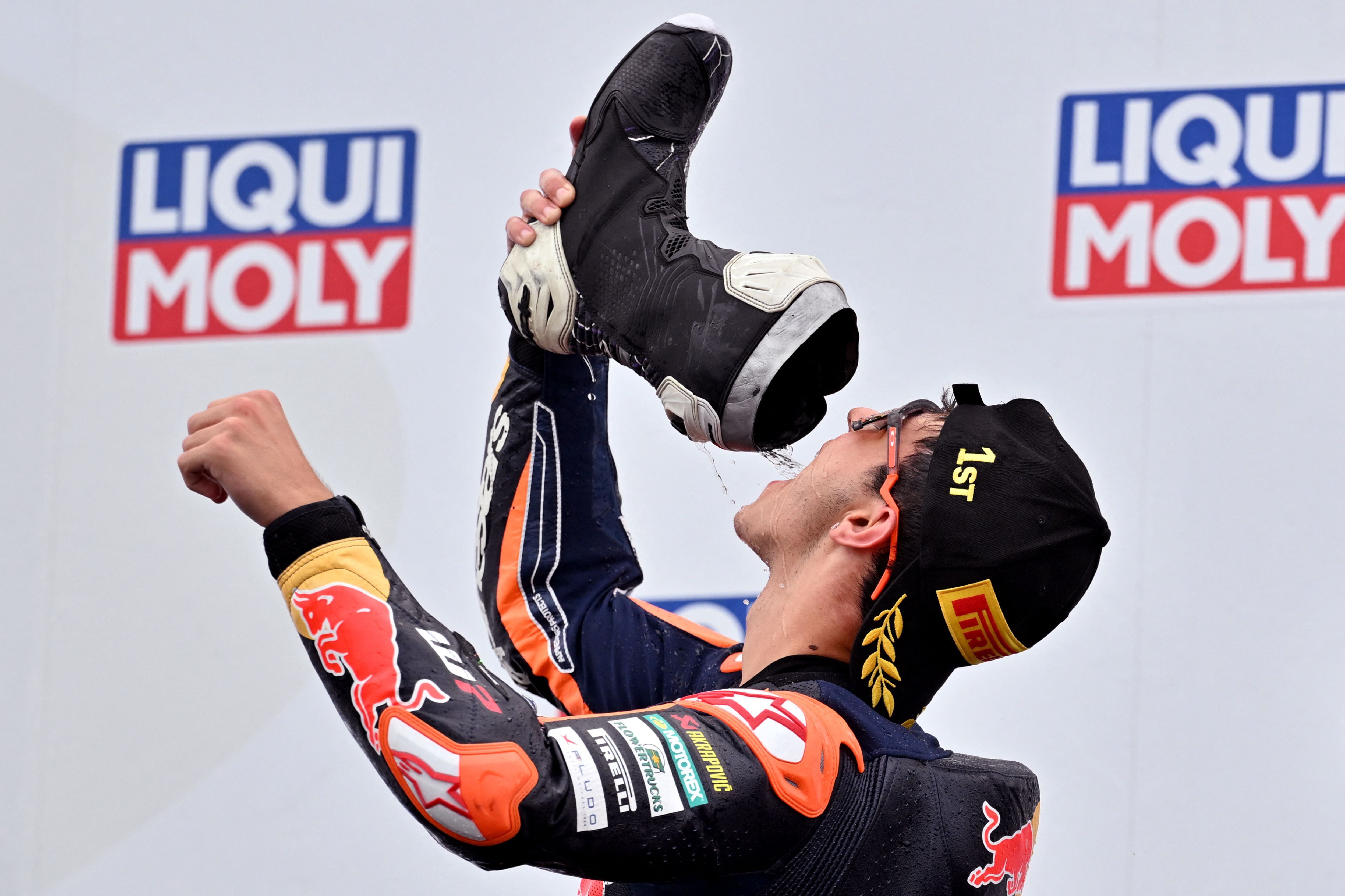 Red Bull KTM Tech3 team's Spanish Moto3 rider Jose Antonio Rueda drinks champagne from his boot as he celebrates winning the Moto3 race at the MotoGP Australian Grand Prix on Philip Island on October 19, 2025. (Photo by Paul Crock/AFP Photo)