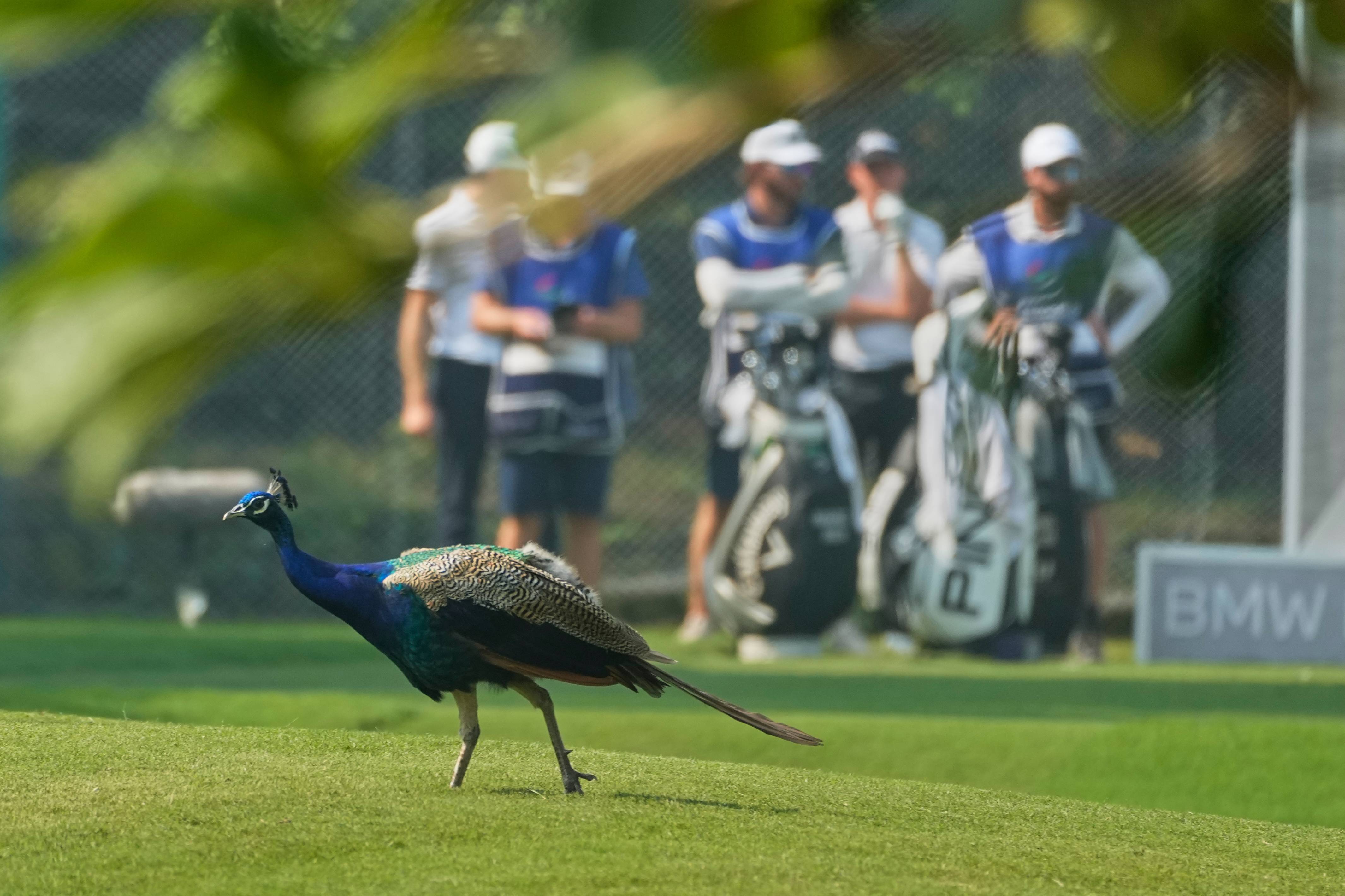 A peacock walks across the green during the DP World Tour Championship golf tournament in New Delhi, India, Thursday, October 16, 2025. (Photo by Manish Swarup/AP Photo)