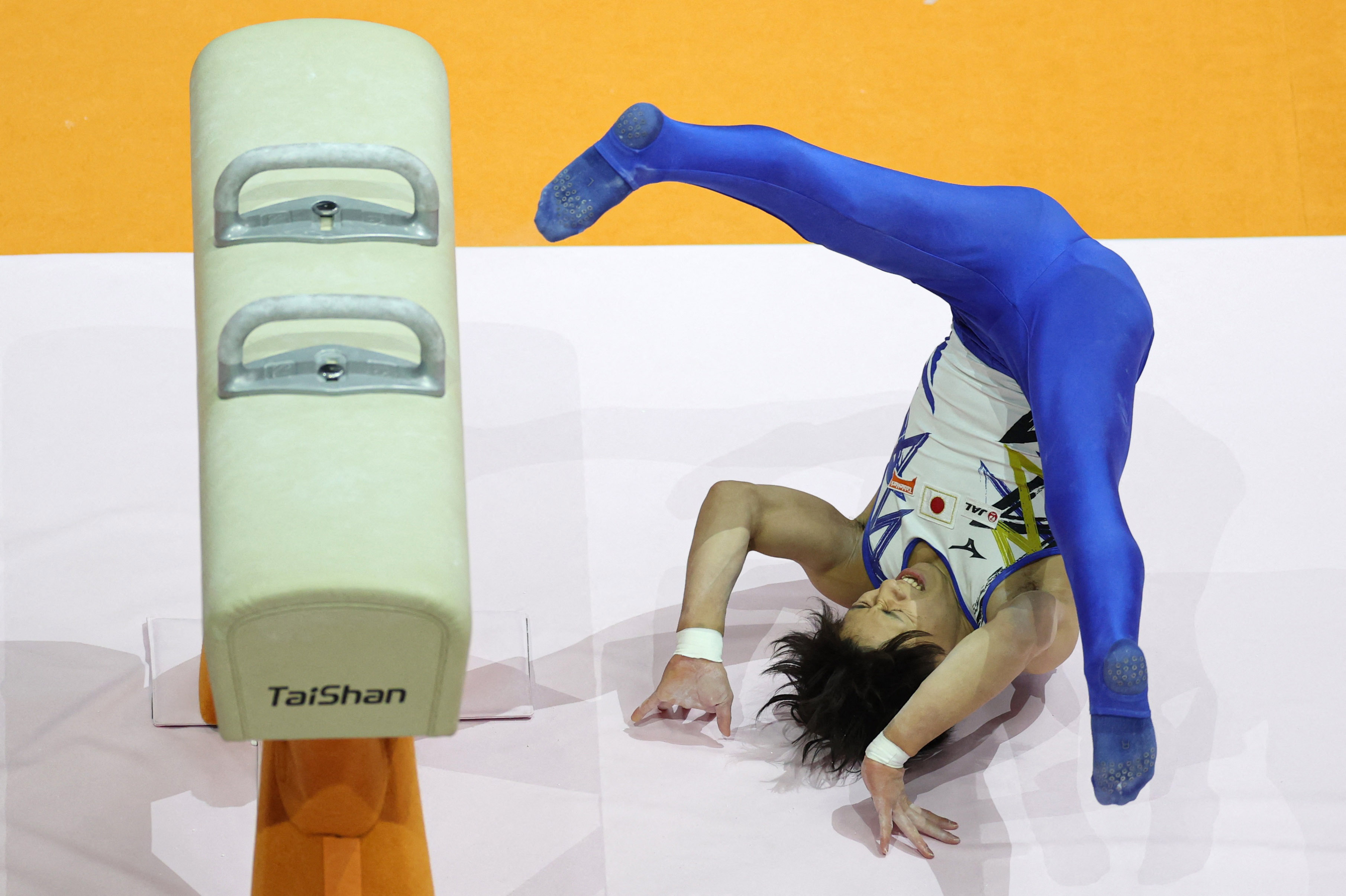 Hiroto Ishizawa of Japan falls while competing on the pommel horse during qualifications at the World Artistic Gymnastics Championships in Jakarta, Indonesia on October 19, 2025. (Photo by Ajeng Dinar Ulfiana/Reuters)