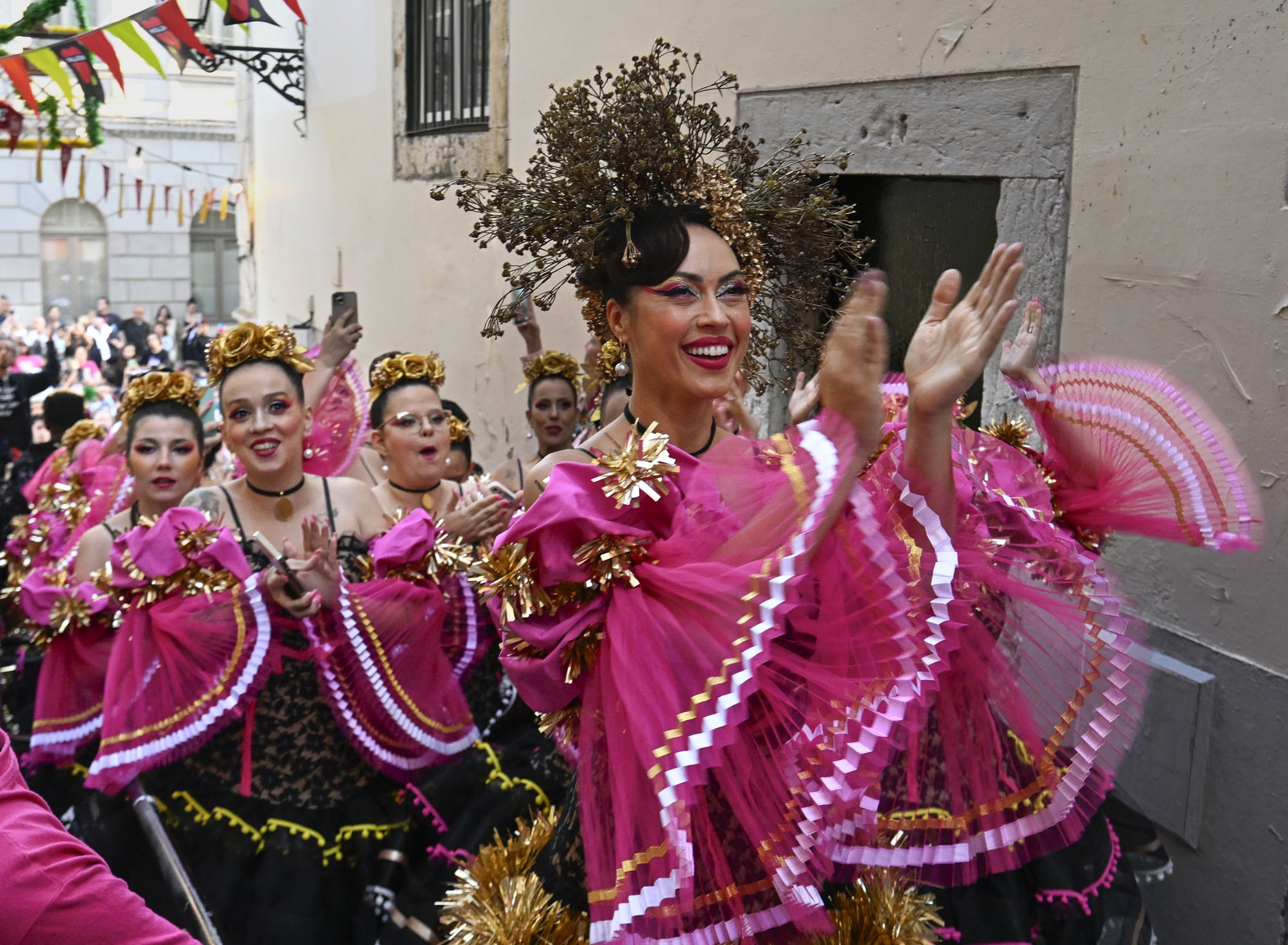 Dancers of Marcha de Bica are seen dressed in costume in the old quarter of Bica before leaving to parade in Avenida da Liberdade on June 12, 2024 in Lisbon, Portugal. Bica is one of the historic neighborhoods filled up with food and drink stalls during celebrations on the eve of Santo Antonio day, dedicated to the Patron Saint of Lisbon, a very important attraction for locals and tourists alike. (Photo by Horacio Villalobos/Corbis via Getty Images)